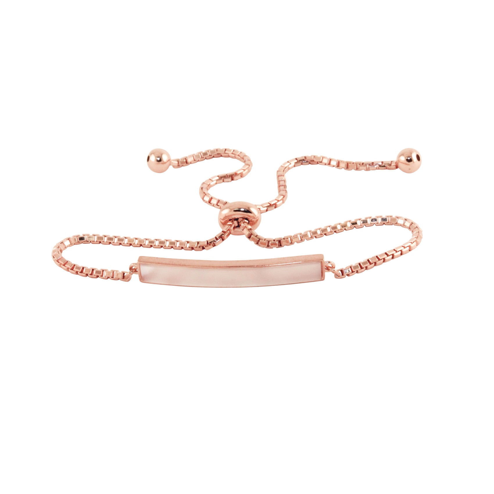 Rose Gold Bolo Adjustable Bracelet, made of .925 sterling silver, rose-gold dipped. Mother of Pearl bar center with adjustable Bolo style link. Strong Links. Adjustable.
