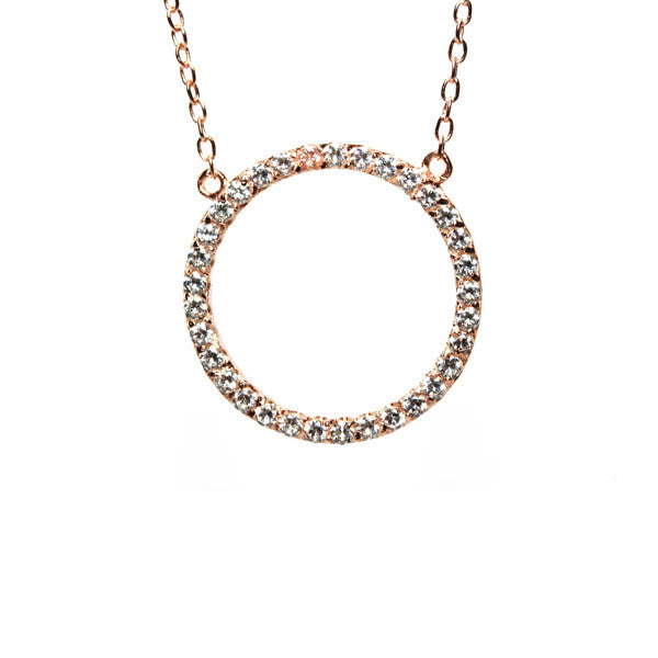 Unit price / perMade of .925 sterling silver. Plated in Rose Gold. Silver link chain features a round circle charm embellished in cubic zirconia. Circle Pendant; .75 inch diameter. Necklace Length Sizing Guide