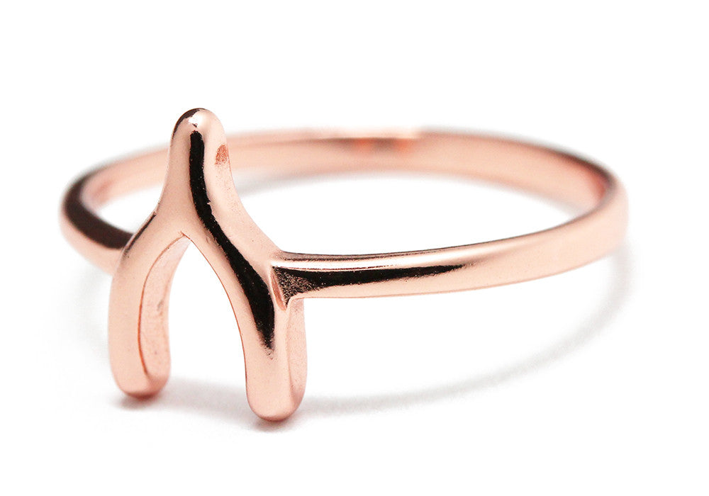 Lucky Wish! sterling silver wishbone ring is made of solid .925 sterling silver, plated in rose gold. Thin Band Ring 2.5mm. Polished finish. gold wishbone motif at center
