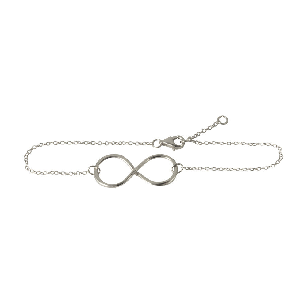 A unique infinity bracelet that is sure to give your wrist some character. Made of .925 sterling silver. Features a polished infinity symbol at center. No bail allows for this bold infinity symbol to move freely. Lobster claw clasp. Contrast between delicate chain and 1 inch infinity charm make for a statement. Stack your wrists with other smaller charm bracelets to make the infinity pop.