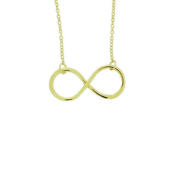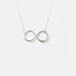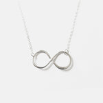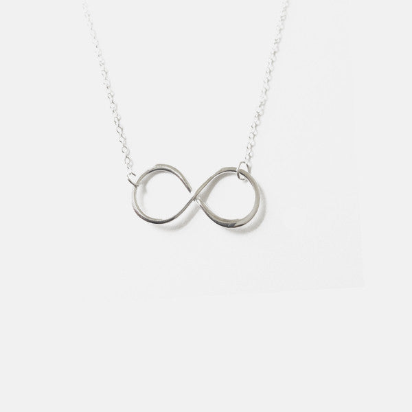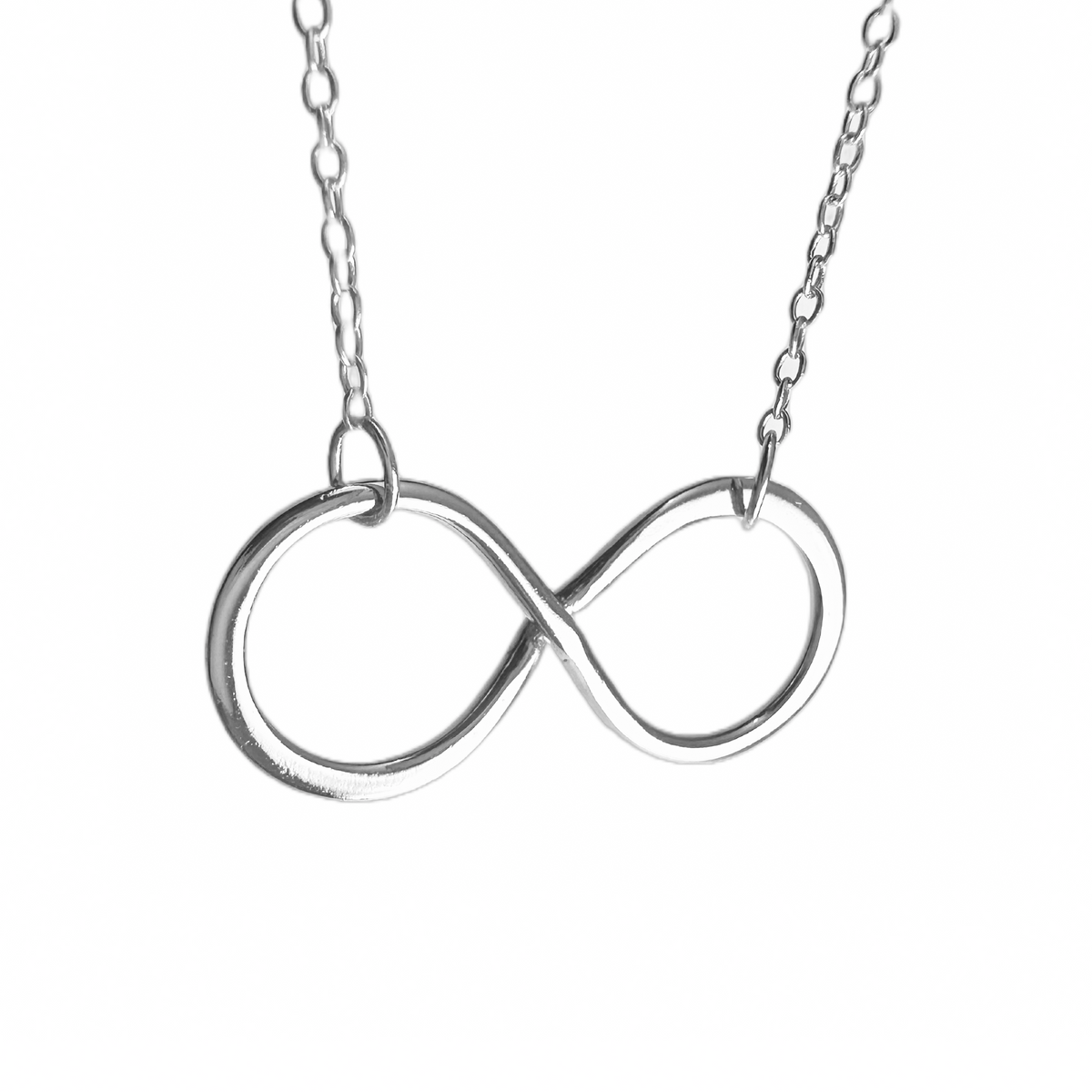 A unique infinity necklace that is sure to give your neck some character. Made of .925 sterling silver. Features a polished infinity symbol at center. No bail allows for this bold infinity symbol to move freely. Lobster claw clasp. Contrast between delicate chain and 1 inch infinity charm make for a statement. Layer up with other smaller pendants to make the infinity pop. 1 inch infinity pendant.