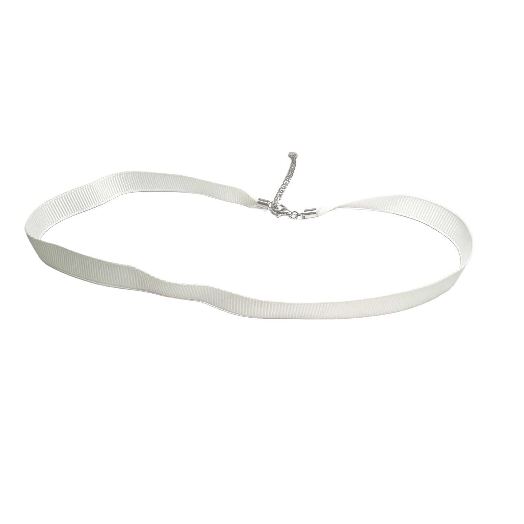 Unit price / perA bright twist to the classic black ribbon choker, a white silky ribbon necklace, gorgeous alone or with a beautiful silver or gold pendant! made with grosgrain and sterling clasp. Choker - Close to collar/neck.