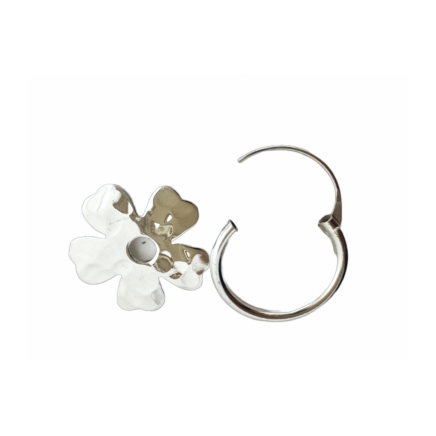 Unit price / perPretty flower hoop earrings, silver Hoop with separate flower charm. Flower charm features hammered finish. ute Flower hoops.