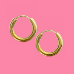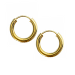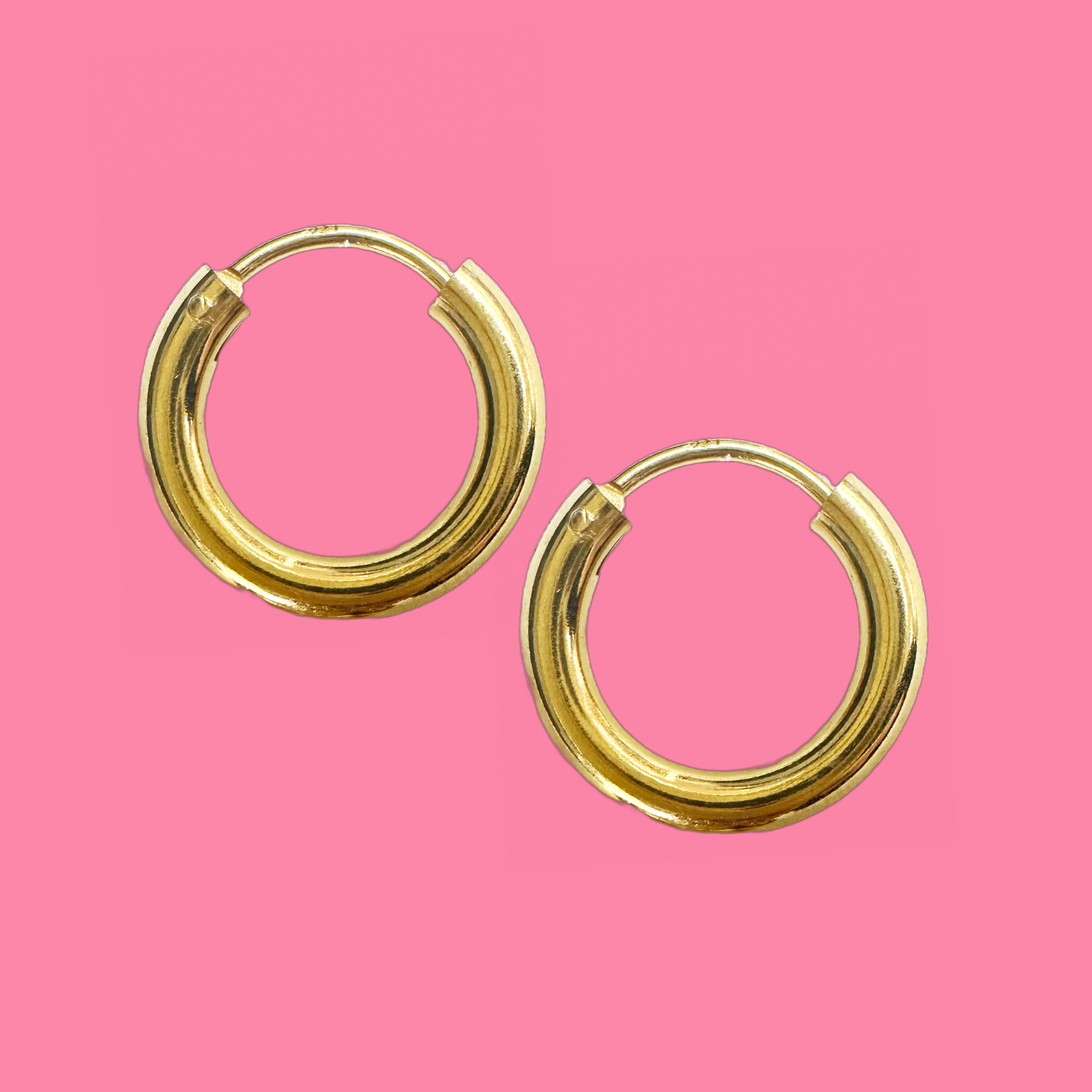Unit price / perA petite and versatile pair of gold plated hoop earrings. Made of .925 Sterling Silver, plated in gold. Round thick hoops that will give your outfit a luxurious appeal. Snap in closure for ultra secure fit.