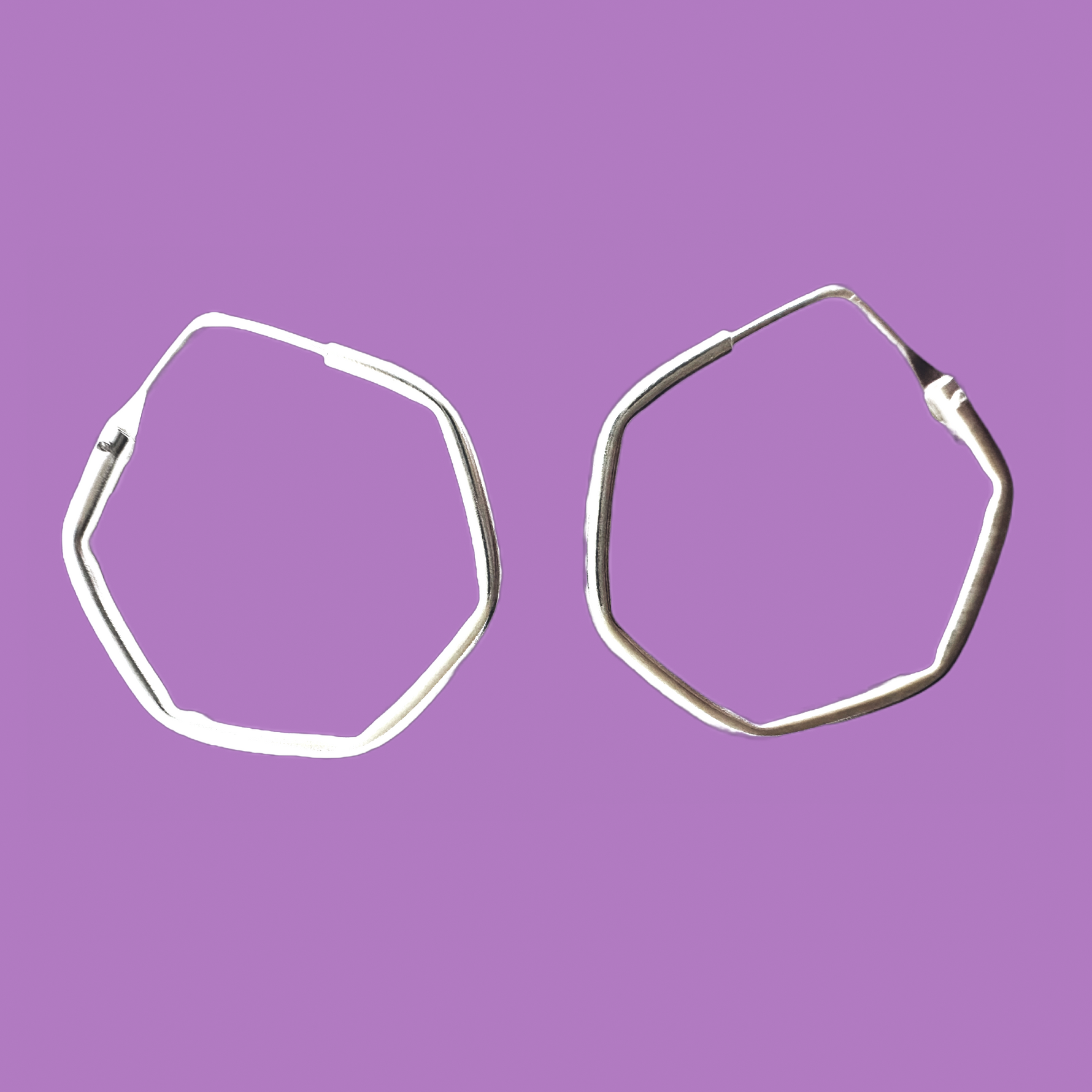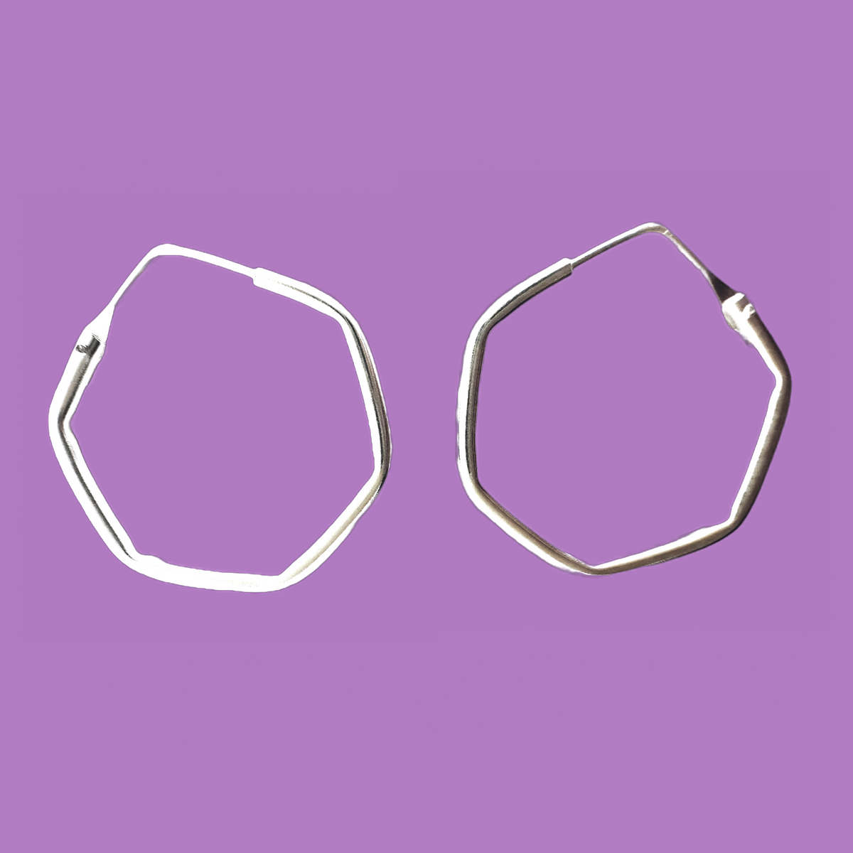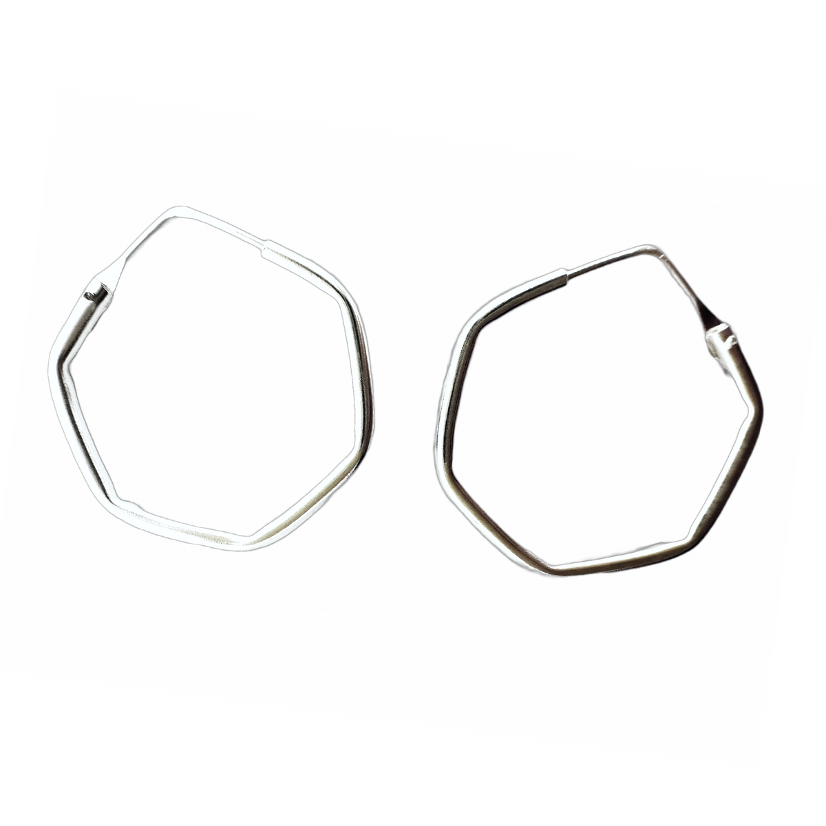 Unique Hexagon-Shape Hoop Earrings, Made of .925 sterling silver. Square motif with seamless top closure. Smooth polished finish. Fine Silver.