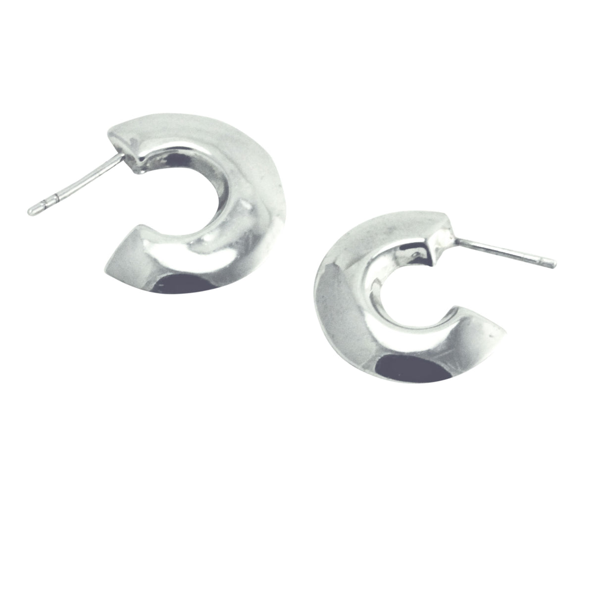 Half Moon Style Hoop Earrings, Made of .925 sterling silver. Polished finish. Studs feature a stellar half puffy moon. Post is at the top of earring. Solid .925 Sterling Silver. Gorgeous modern hoop. Vintage style, limited availability.