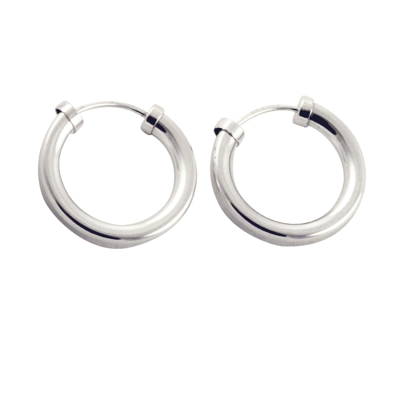 Unit price / perA petite and versatile pair of Sterling hoop earrings. Made of .925 Sterling Silver. Round thick hoops that will give your outfit a luxurious appeal. Snap in closure for ultra secure fit.