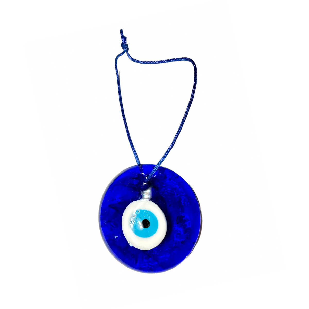 Evil eye amulet, made of glass and enamel paint. Perfect for your home or car. Looks good on a wall or doorknob.