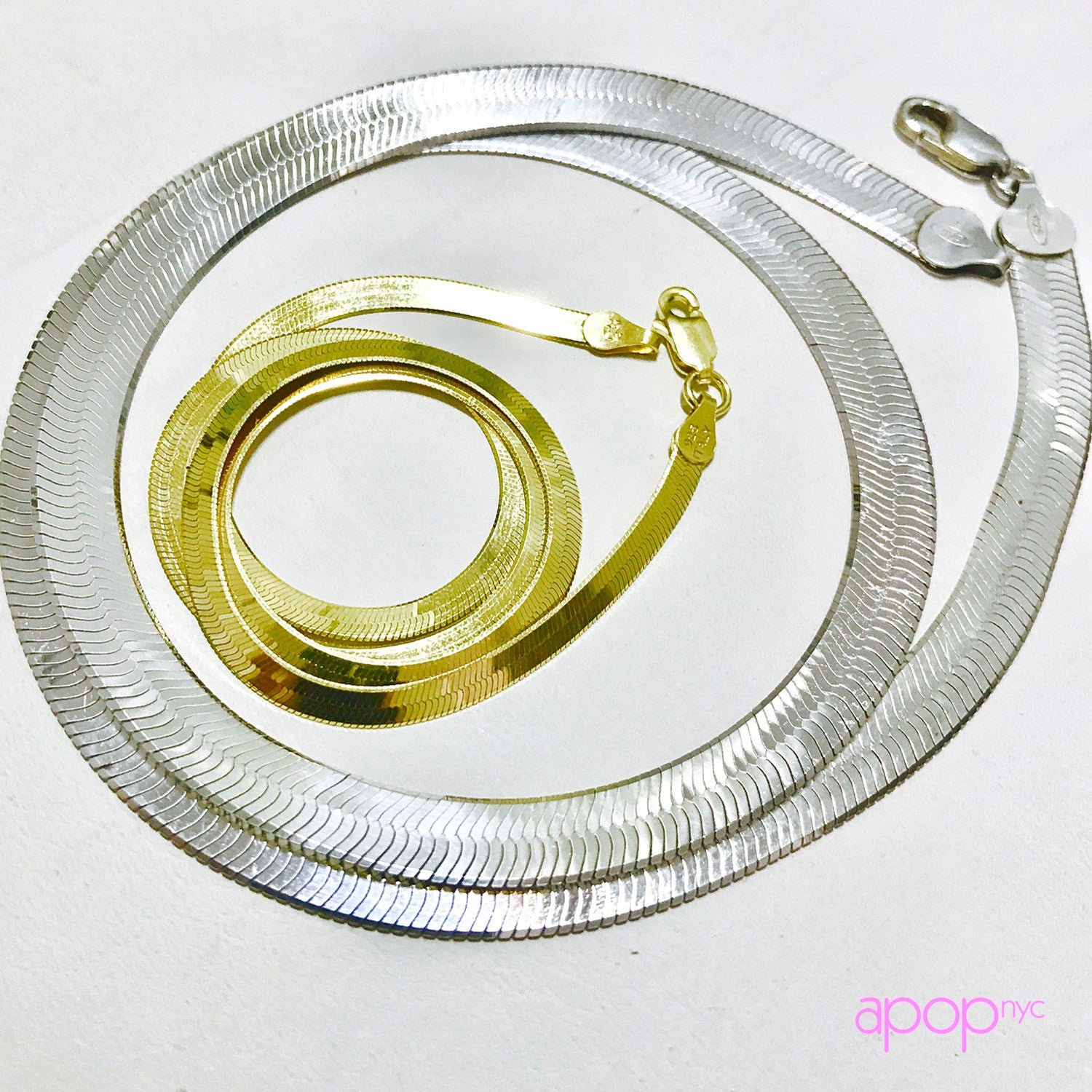 modern herringbone necklace. Italian Chain is .925 sterling silver. Lobster claw for safety clasp. Glistening Sterling. Wide.