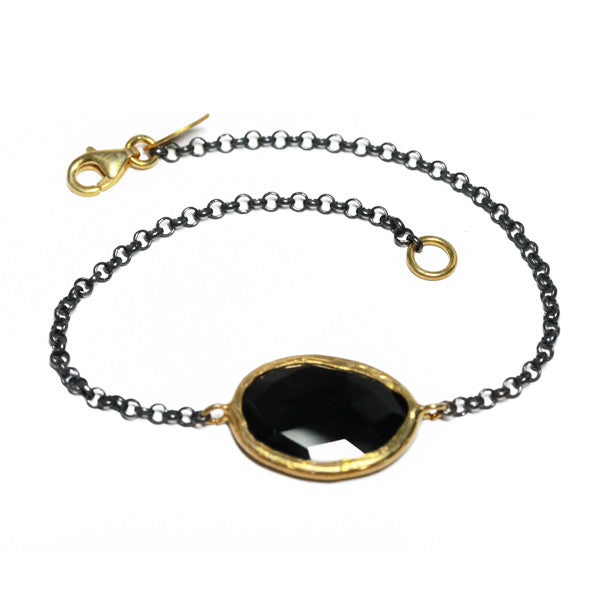 Unit price / perGenuine black onyx stone bracelet. made of sterling silver, plated in 18k gold and black rhodium. gorgeous black chain with yellow gold vermeil accents.