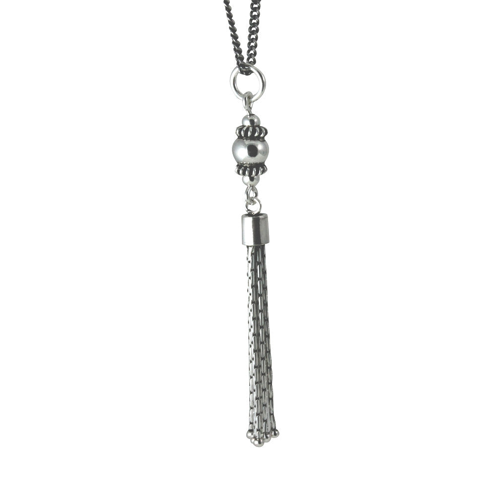 Made of .925 sterling silver. Bali style pendant features liquid silver tassels at end. Bead is approx 8mm diameter. 20 - 30 inch Chain available. may be blackened (oxidized) silver or sterling silver. Please email us if you'd like a blackened chain instead.