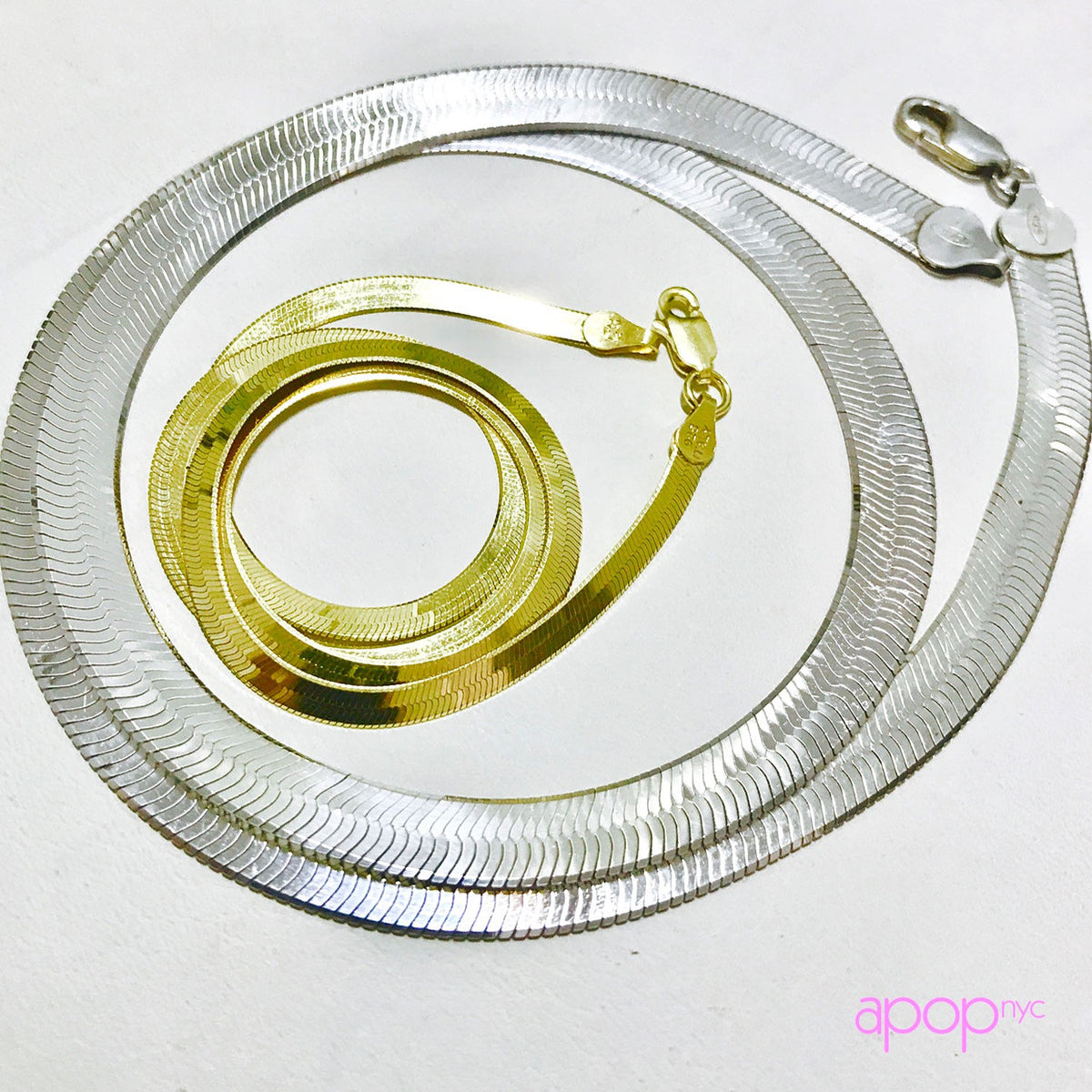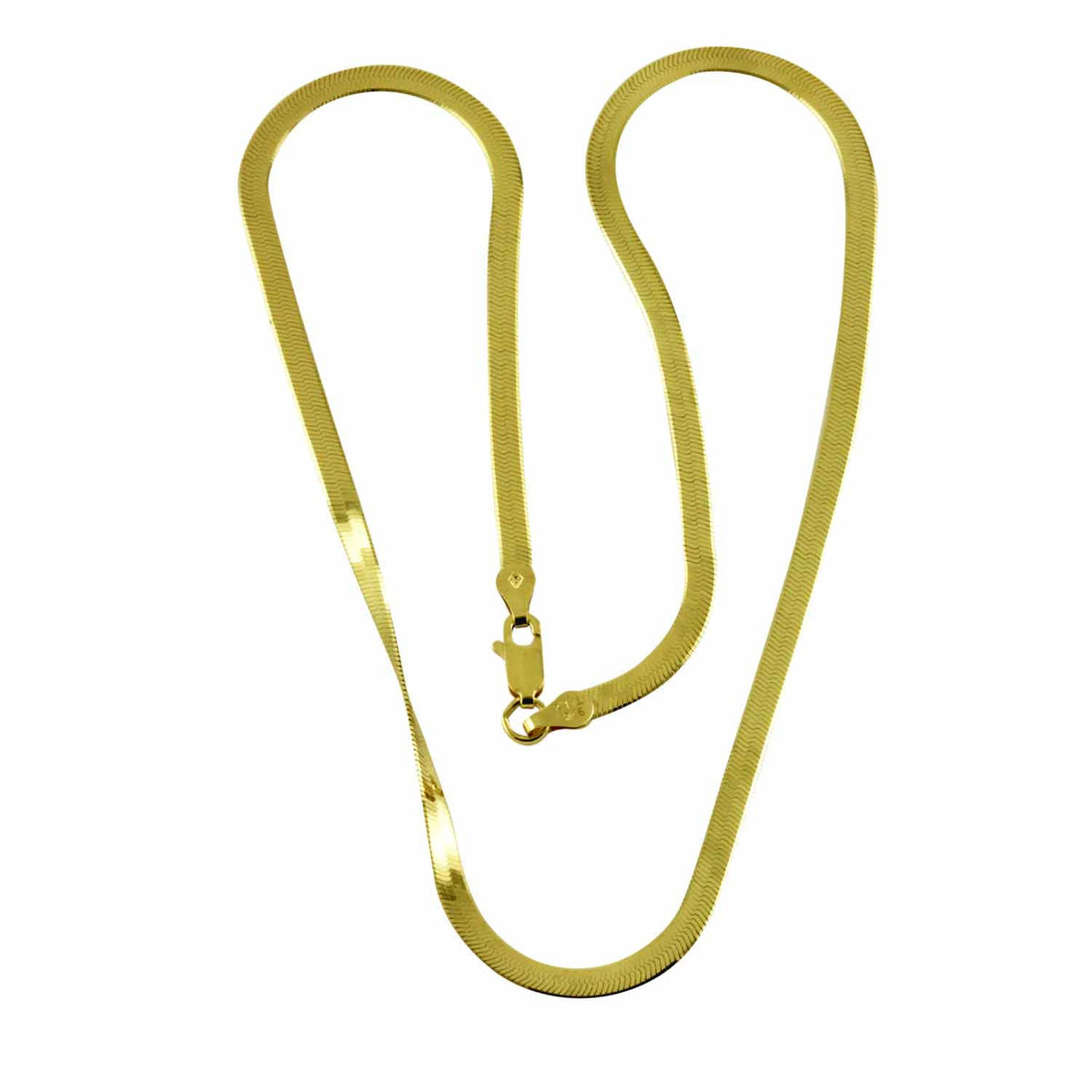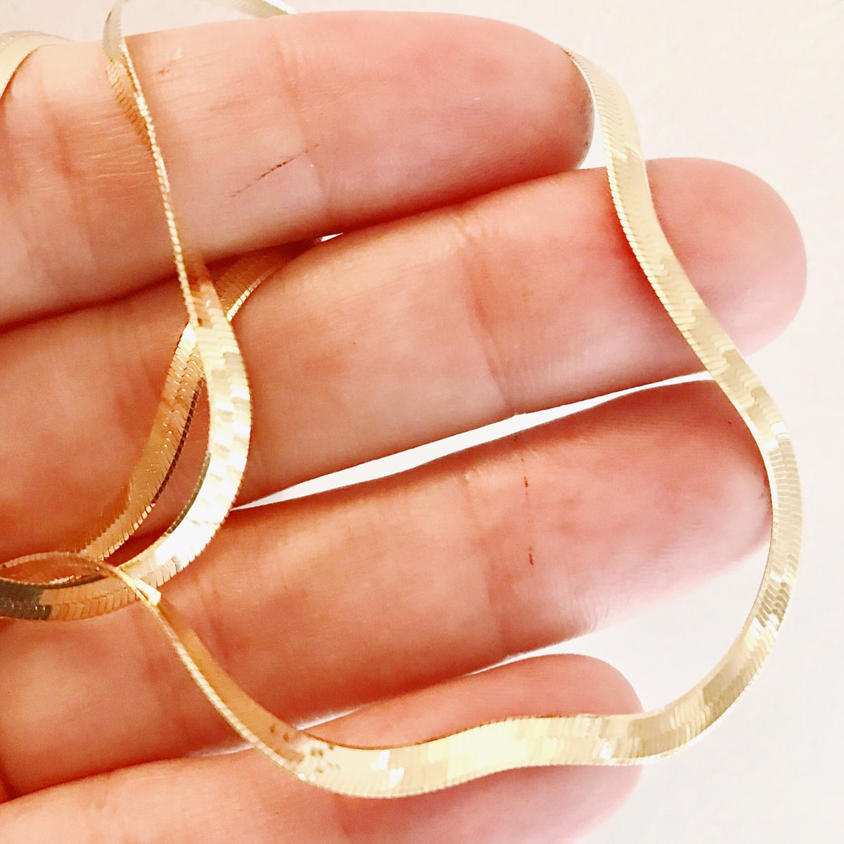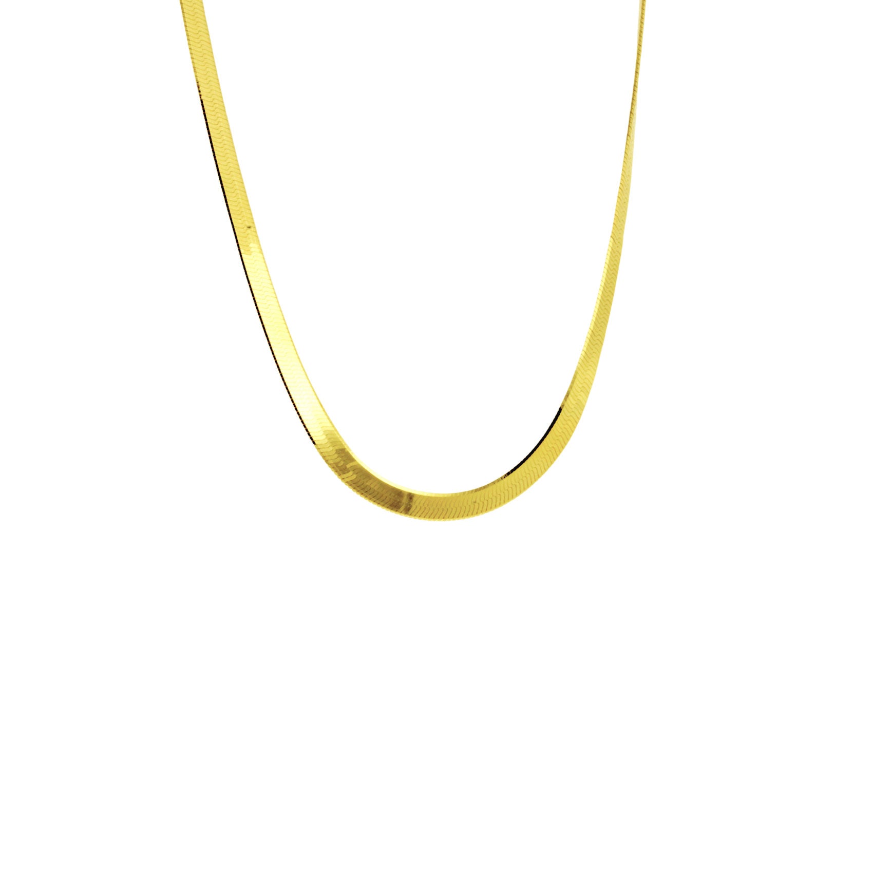 modern gold-dipped herringbone snake necklace. Italy. Chain is .925 sterling silver. Lobster claw for safety clasp. Glistening modern necklace. 16 inch, close to collarbones, not a choker. Photo is stylized to display thickness of necklace, lays flat on collar.