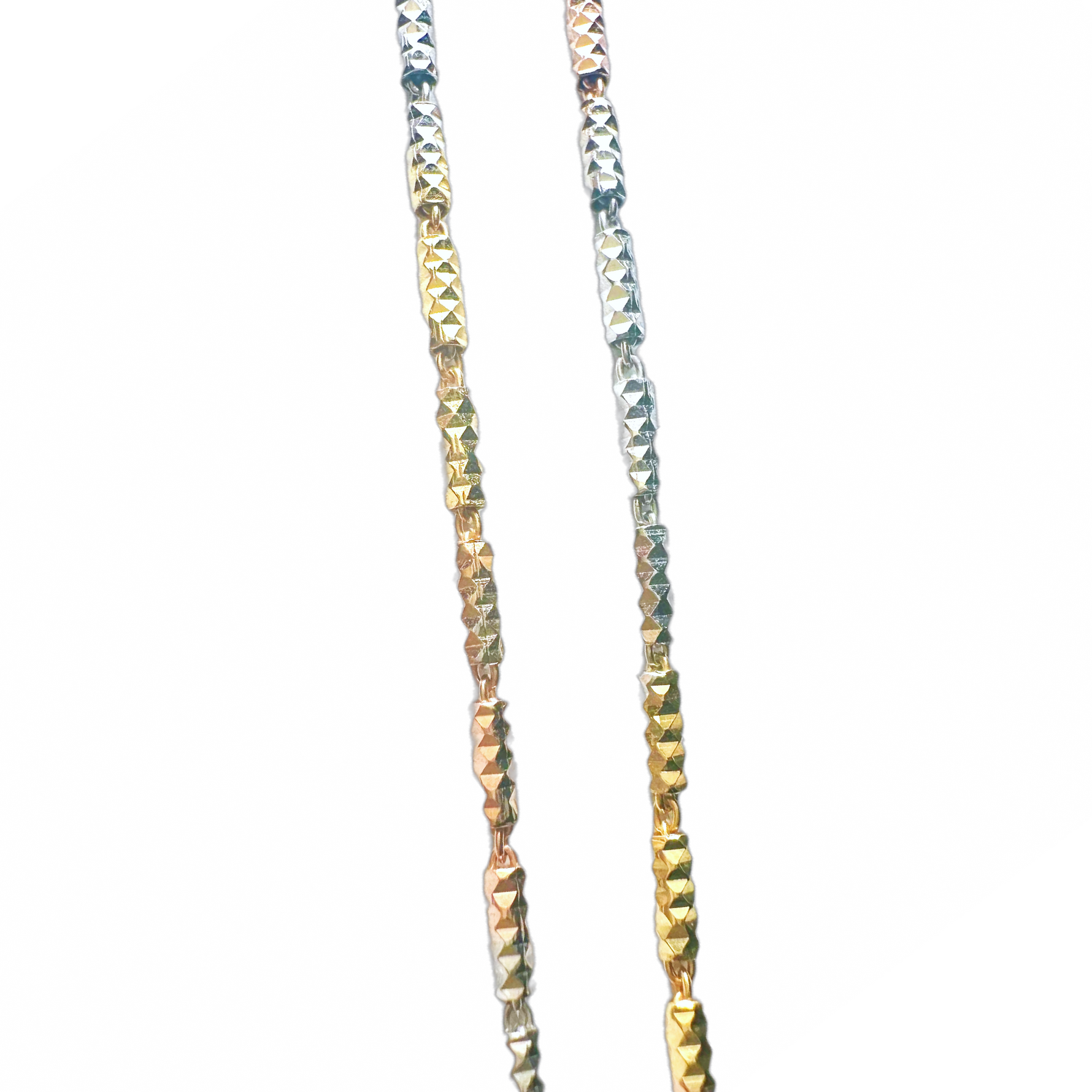 apop Essentials, chic three tone necklace, featuring a bar style link in silver, rose and gold plated tones. Wear this unique chain with your favorite charm or alone. Elegant and versatile . Shimmer, shimmer. Delicate enough for a stand alone piece. Made of .925 sterling silver and finished in yellow gold and rose gold. Secure clasp for a secure fit. May be worn by a fine lady or gentleman. Italy. Unisex