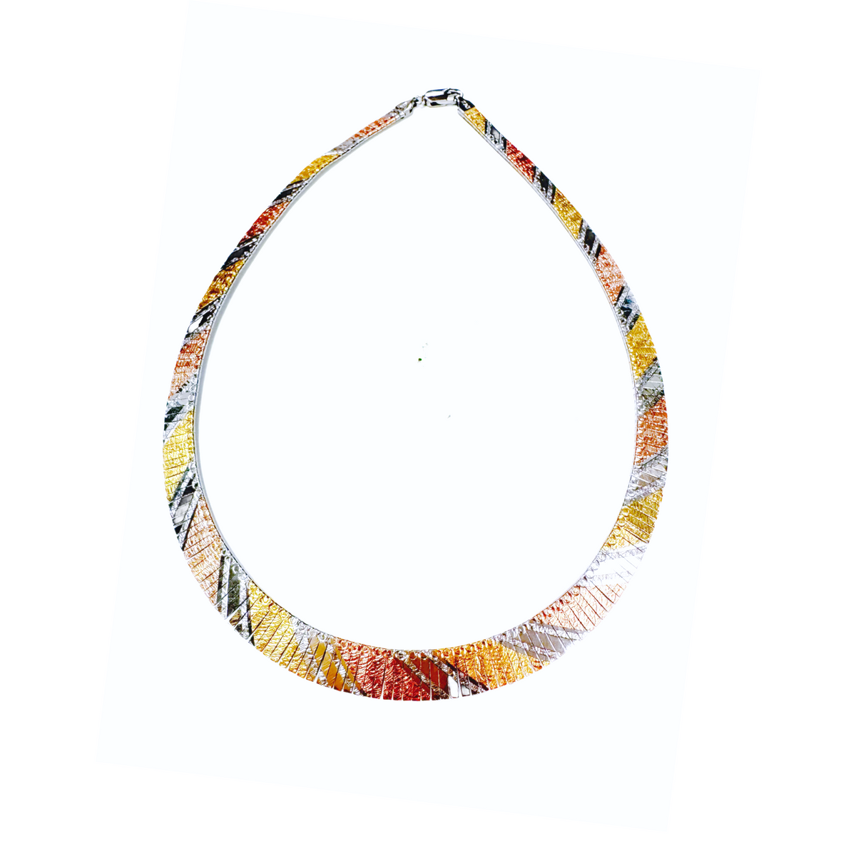 modern three tone necklace. Italy. Chain is .925 sterling silver. Lobster claw for safety clasp. Glistening modern necklace. 16 inch, close to collarbones, not a choker. Photo is stylized to display thickness of necklace, lays flat on collar.