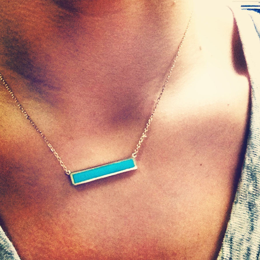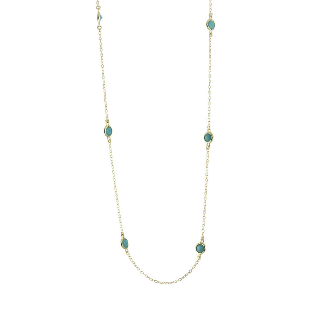 gold dipped dotted station necklace, made of .925 sterling silver, plated in gold with a simulated turquoise tone enamel inlay. dainty chain features approximately 7 turquoise-color dots.