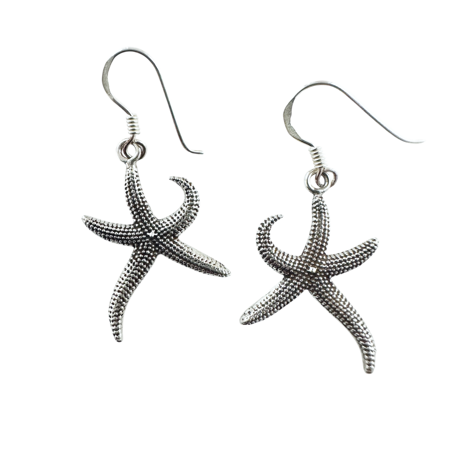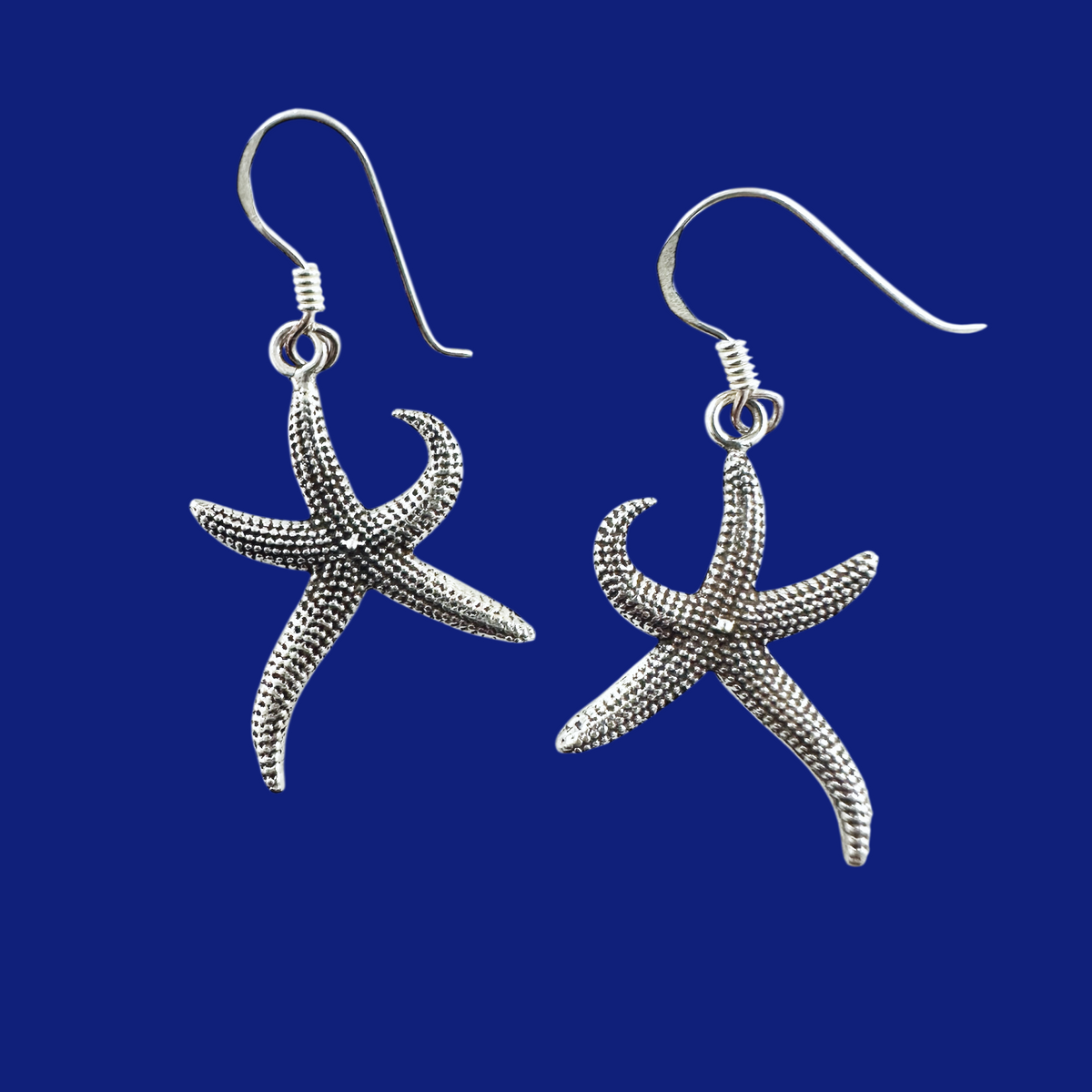 ocean starfish drop earrings, made of silver. nautical starfish dangle drop earrings. Gorgeous on vacation or tropical outfit. Darkened finish.