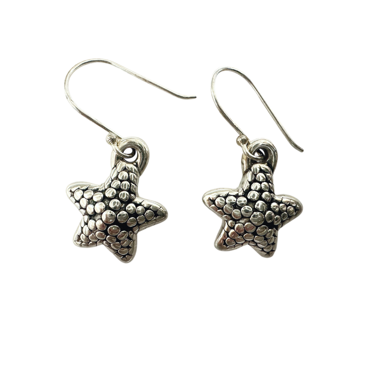 ocean starfish drop earrings, made of silver. nautical starfish dangle drop earrings. Gorgeous on vacation or tropical outfit. Darkened finish.