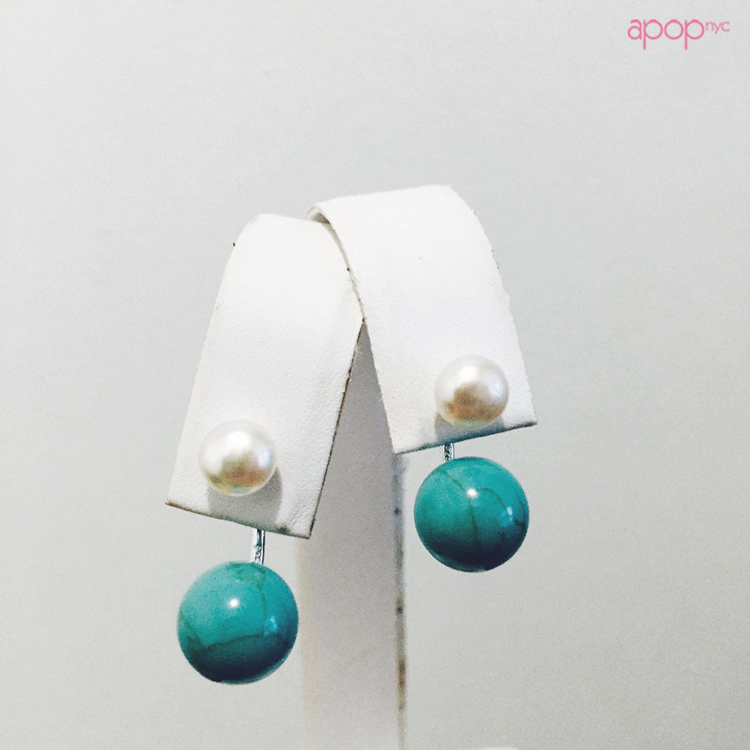 modern pair of pearl jacket earrings, made of sterling silver post. freshwater pearls. although these daring double pearl earrings seem to carry weight, they are soft on the earlobes. Simple yet fabulous.