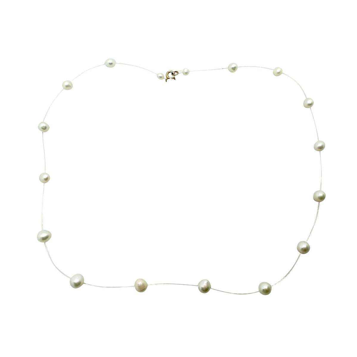 pearl floating necklace. Necklace made with 14k gold clasp  and cultured freshwater pearl. Pearls decorate collar. invisible style string gives a floating illusion. A fun wardrobe staple for any pearl addict!