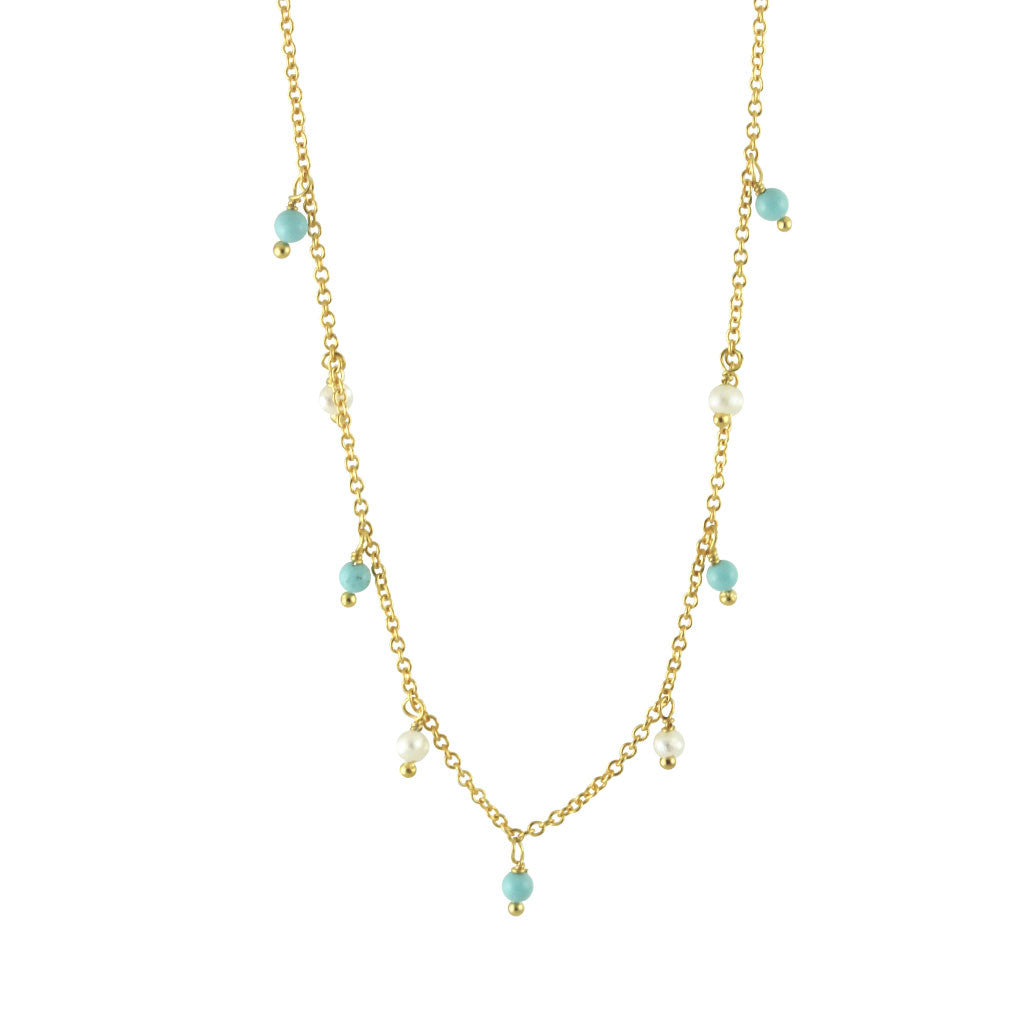 Unit price / pergold dipped beaded station necklace, made of .925 sterling silver, plated in gold with small simulated turquoise beads & cultured pearls. dainty chain features approximately 7 mini drops.