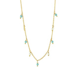 gold dipped beaded station necklace, made of .925 sterling silver, plated in gold with small simulated turquoise beads & cultured pearls. dainty chain features approximately 7 mini drops.