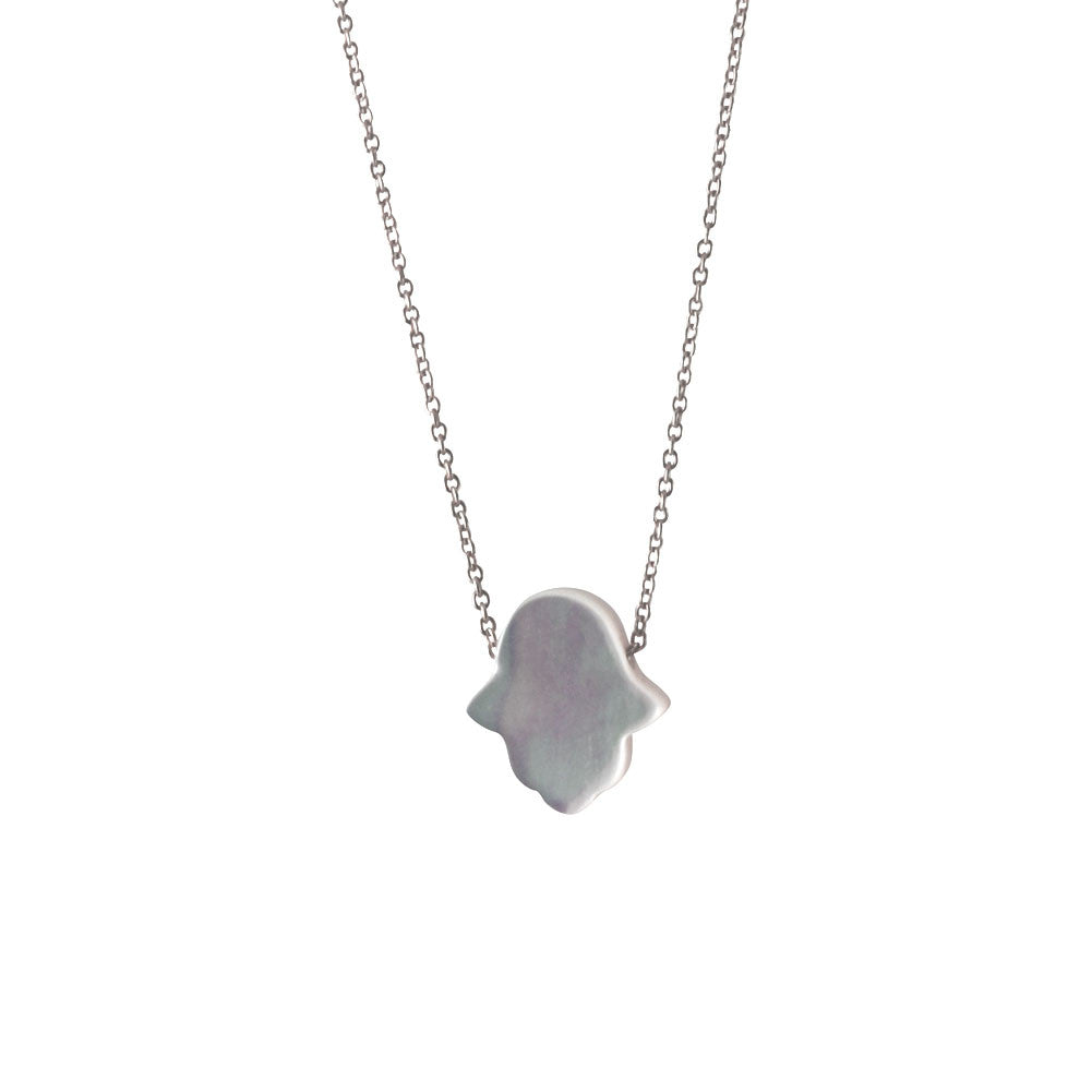 Simple and classic hamsa necklace. Made of .925 sterling silver. Featuring a .mother of pearl hamsa charm at center of necklace. Dainty rolo chain with spring ring clasp. Looks nice worn alone or paired with other dainty rose gold chains. Also available in 18k yellow gold and sterling silver.