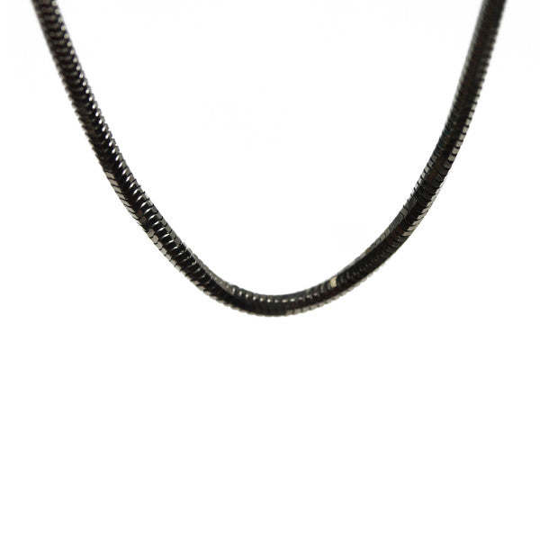 Sparkle and shine with our beautiful black snake chain "slinky" necklace. Made of .925 sterling silver, plated in black gunmetal. x Lobster claw clasp for a secure closure. Round shape of black chain enhances the polished finish through light reflection. Pair with polished sterling silver stud earrings for a glamorous and glistening day to night look. Italy. 30 inch length allow for a double strand necklace.