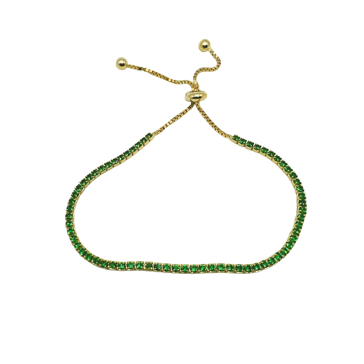 Unit price / perGlowing green tennis bracelet, made of .925 sterling silver, plated in gold and green cubic zirconia. prong setting features a 4mm green CZ stone. Adjustable tennis bracelet, fits most. Adjusts 6 to 9 inch.