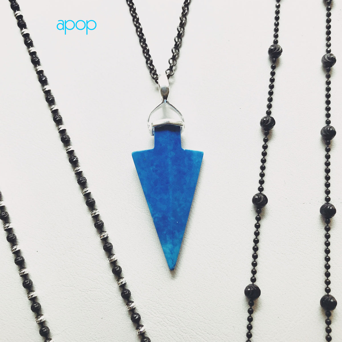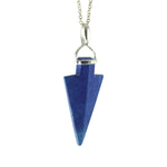 Unit price / perBlue dagger pendant,.925 sterling silver bale. Chain is made of .925 sterling silver. Featuring a spiked set blue style stone at center. Arrowhead style motif. Outstanding blue pendant. Sterling silver modern chain. Choose your chain combination
