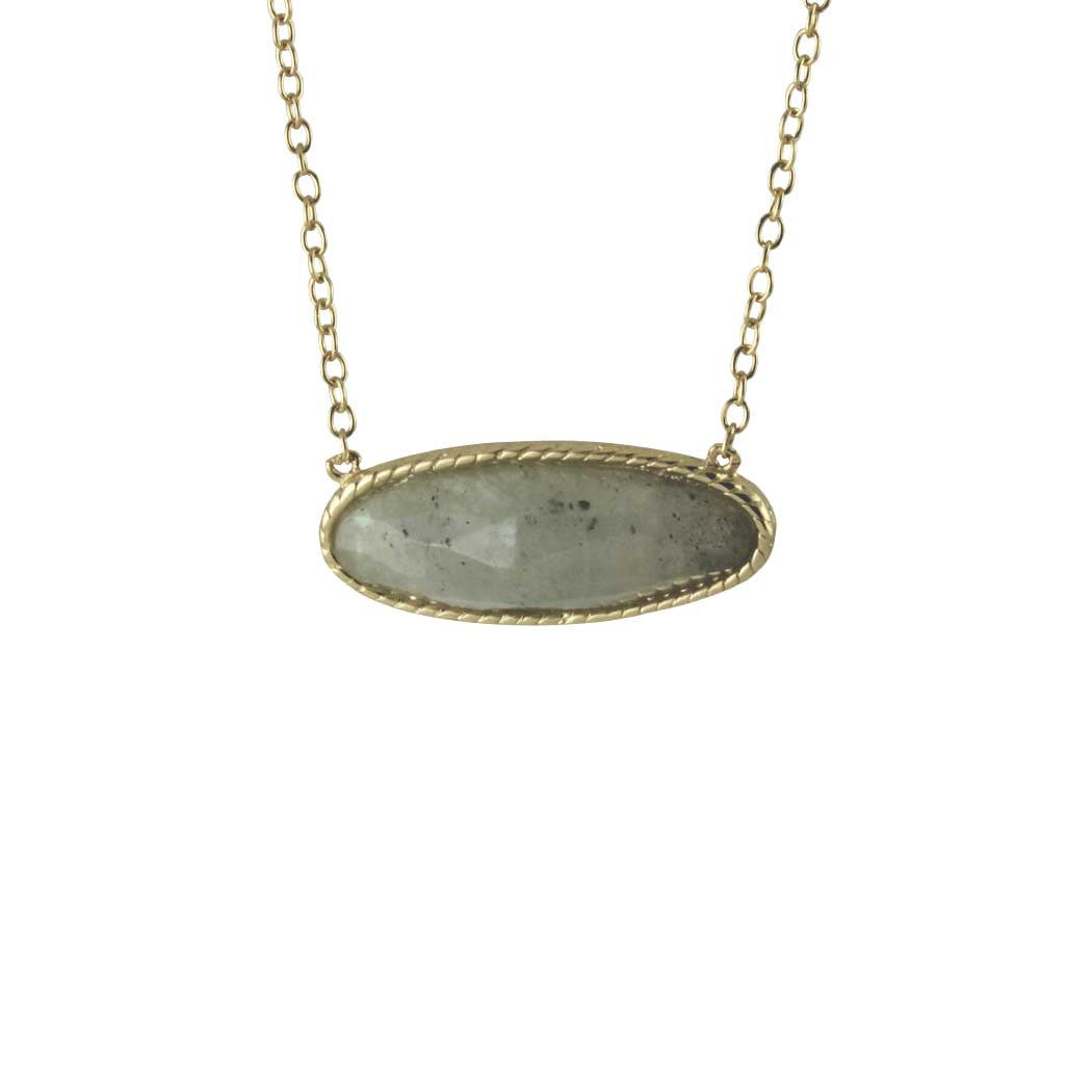 Glamorous green stone necklace, Made of .925 sterling silver. Plated in Yellow Gold. oval bezel, with roped edge. Labradorite style stone pendant. 17 inch total length. Great for mom!
