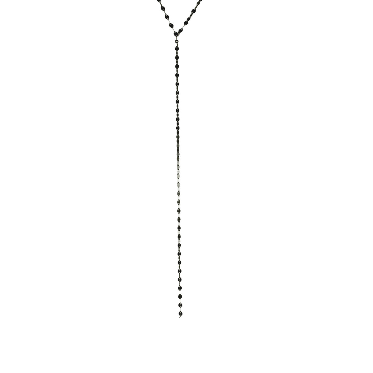a cool black lariat necklace that is sure to jazz up any outfit. Made of .925 sterling silver dipped in black rhodium. a gorgeous intricate chain features a long vertical bar at center with a chain drop. Beautiful lariats never go out of style. Spring Ring clasp. For a complementing look, pair with bar stud earrings. Y Necklace