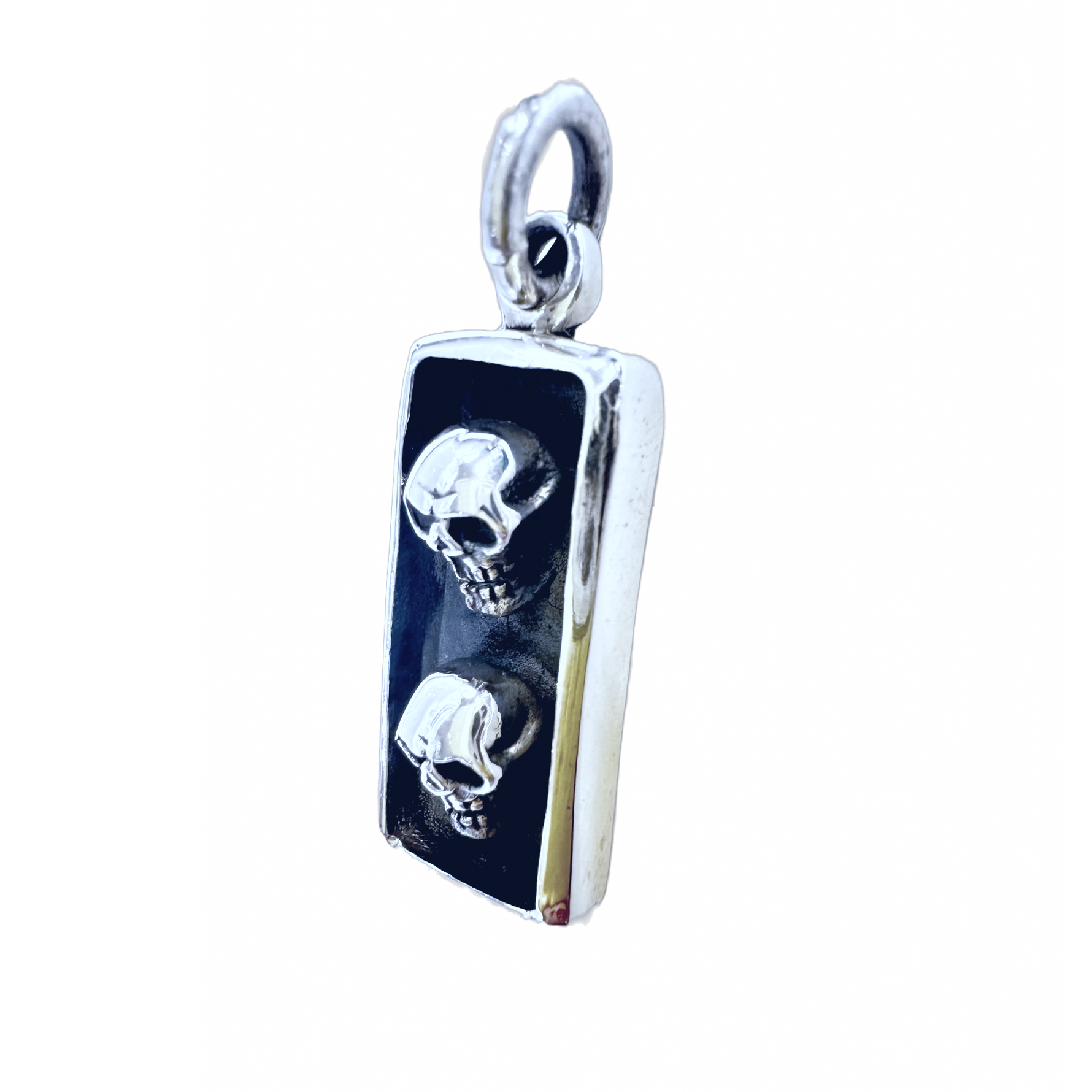 Price / perDouble skull pendant necklace. Made of .925 sterling silver. Features a two silver skull pendant within a case shape bar. Cool and macabre.