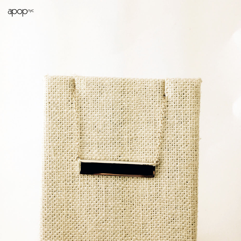 gold dipped bar pendant necklace, made of .925 sterling silver, plated in gold with a black tone enamel inlay. dainty chain features a black bar pendant. made of sterling silver.
