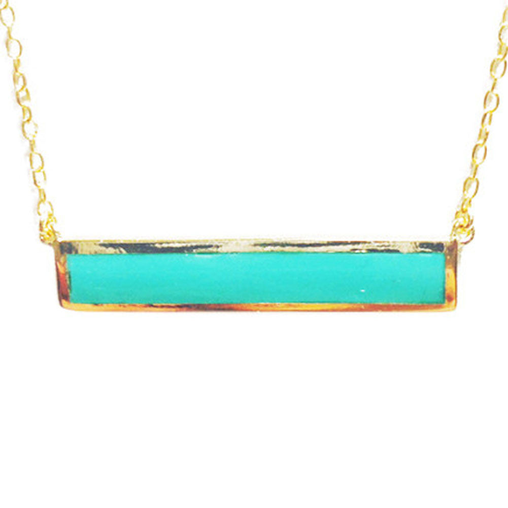 gold dipped bar pendant necklace, made of .925 sterling silver, plated in gold with a synthetic turquoise tone enamel inlay. dainty chain features a turquoise silver bar pendant made of sterling silver.