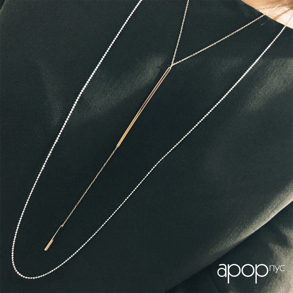 Unit price / pera unique lariat necklace that is sure to jazz up any outfit. Made of .925 sterling silver dipped in rose gold. a gorgeous simple chain features a long vertical bar at center with a chain drop. Beautiful lariats never go out of style. Spring Ring clasp. For a complementing look, pair with bar stud earrings. Y Necklace