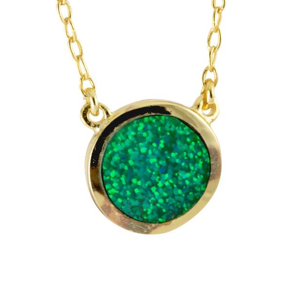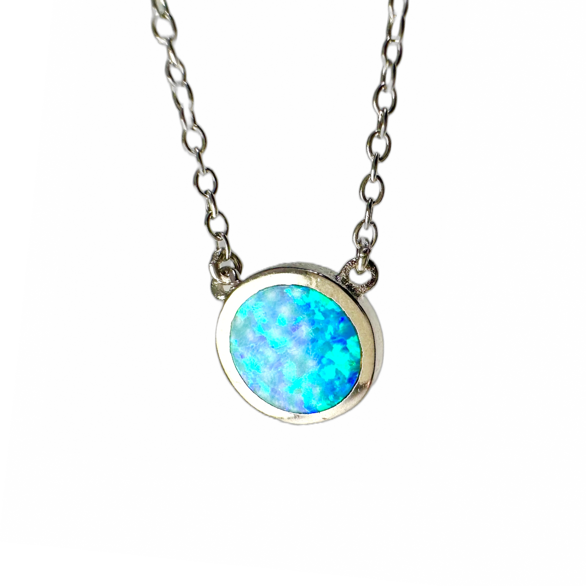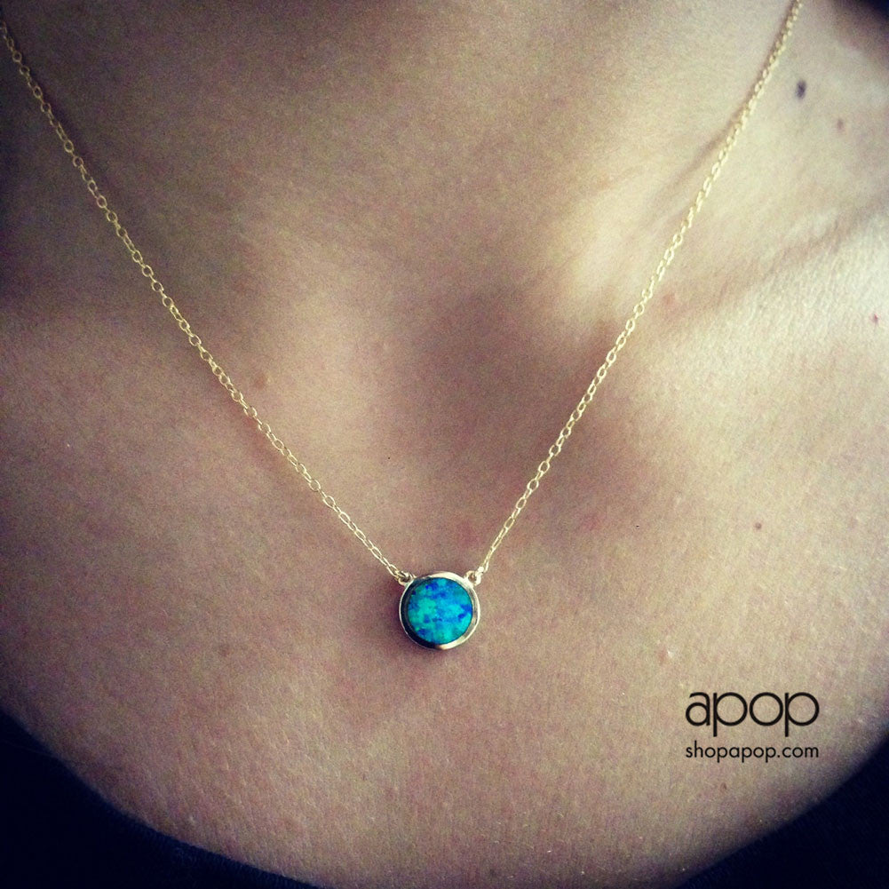 blue opal solitaire necklace Made of .925 sterling silver, plated in rose gold. Featuring a simulated blue opal at center. Simple and versatile. Great for layering - Picture is magnified for detail. matching blue opal earrings available. Center is blue is green speckles as pictured on model.