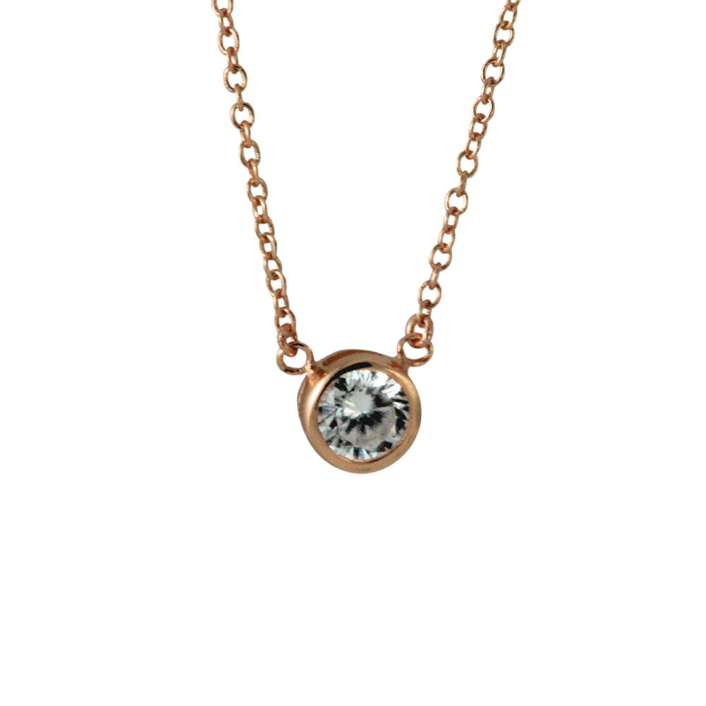 Mini solitaire necklace Made of .925 sterling silver. Plated in Rose Gold. Featuring a 6-7mm cubic zirconia at center. Simple and versatile. Great for layering. Picture is magnified for detail. Complementing Bracelet Available. Rose gold vermeil solitaire bracelet available.