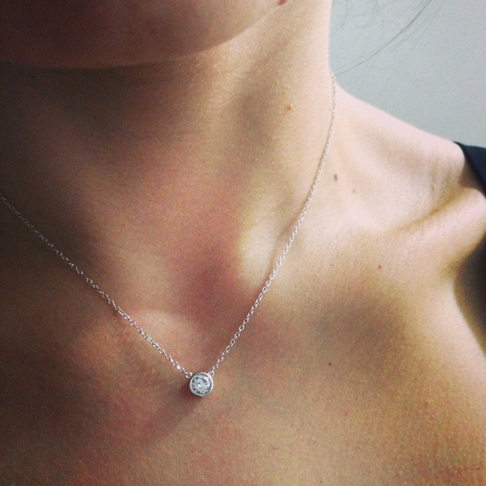 Unit price / perMini solitaire necklace Made of .925 sterling silver. Plated in Rose Gold. Featuring a 6-7mm cubic zirconia at center. Simple and versatile. Great for layering. Picture is magnified for detail. Complementing Bracelet Available. Rose gold vermeil solitaire bracelet available.