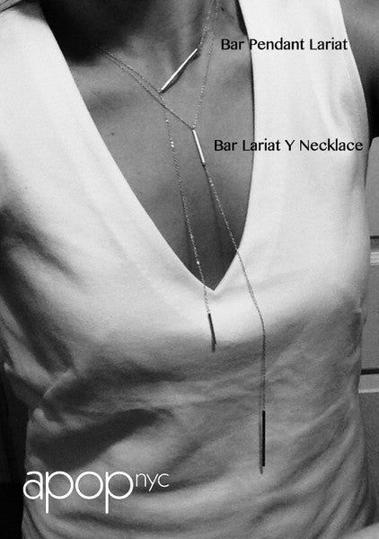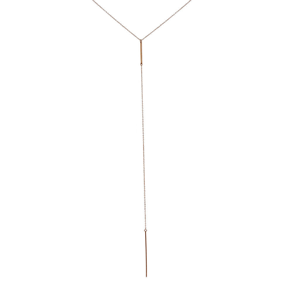 a unique lariat necklace that is sure to jazz up any outfit. Made of .925 sterling silver dipped in rose gold. a gorgeous simple chain features a vertical bar at center with a 10 inch chain drop. Beautiful lariats never go out of style. Spring Ring clasp. For a complementing look, pair with bar stud earrings. Y Necklace