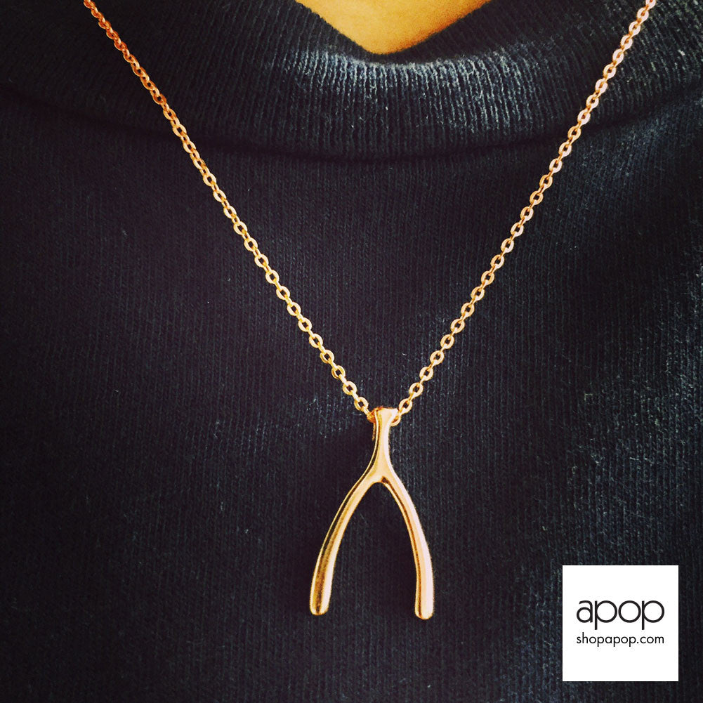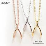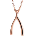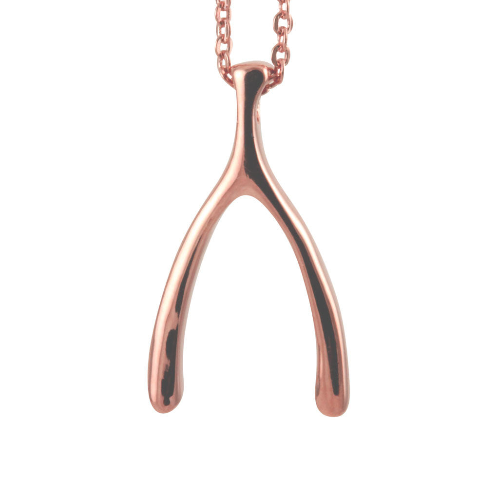 Make a wish! Rose Gold Wishbone necklace, made of .925 sterling silver, plated in rose gold. a charming wishbone pendant charm accompanies this 16 inch rose gold plated chain