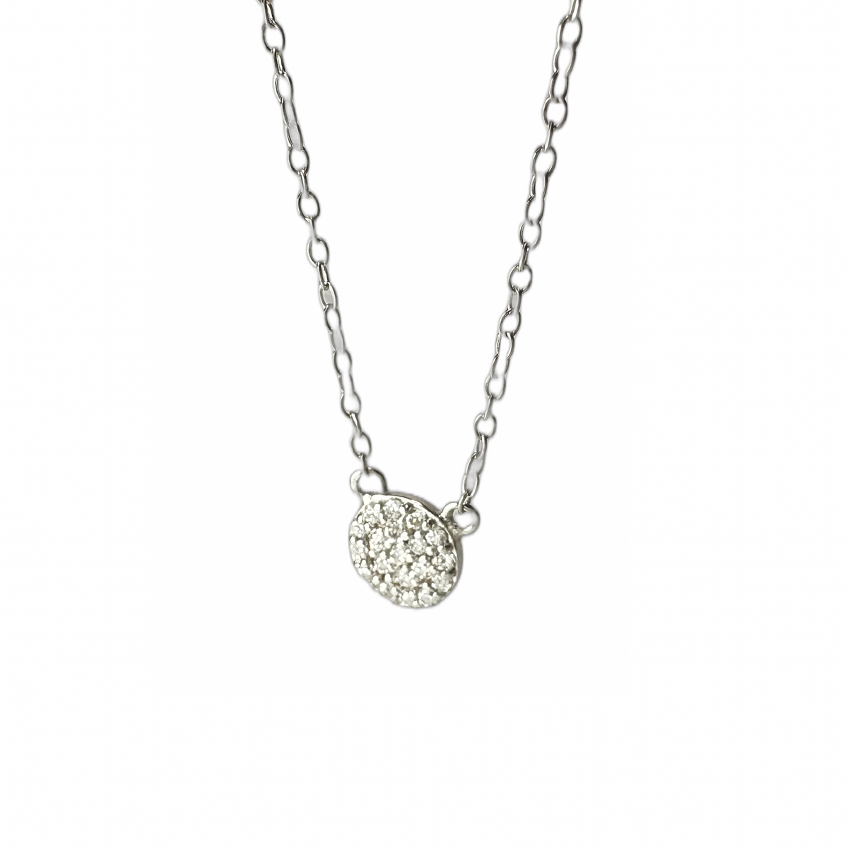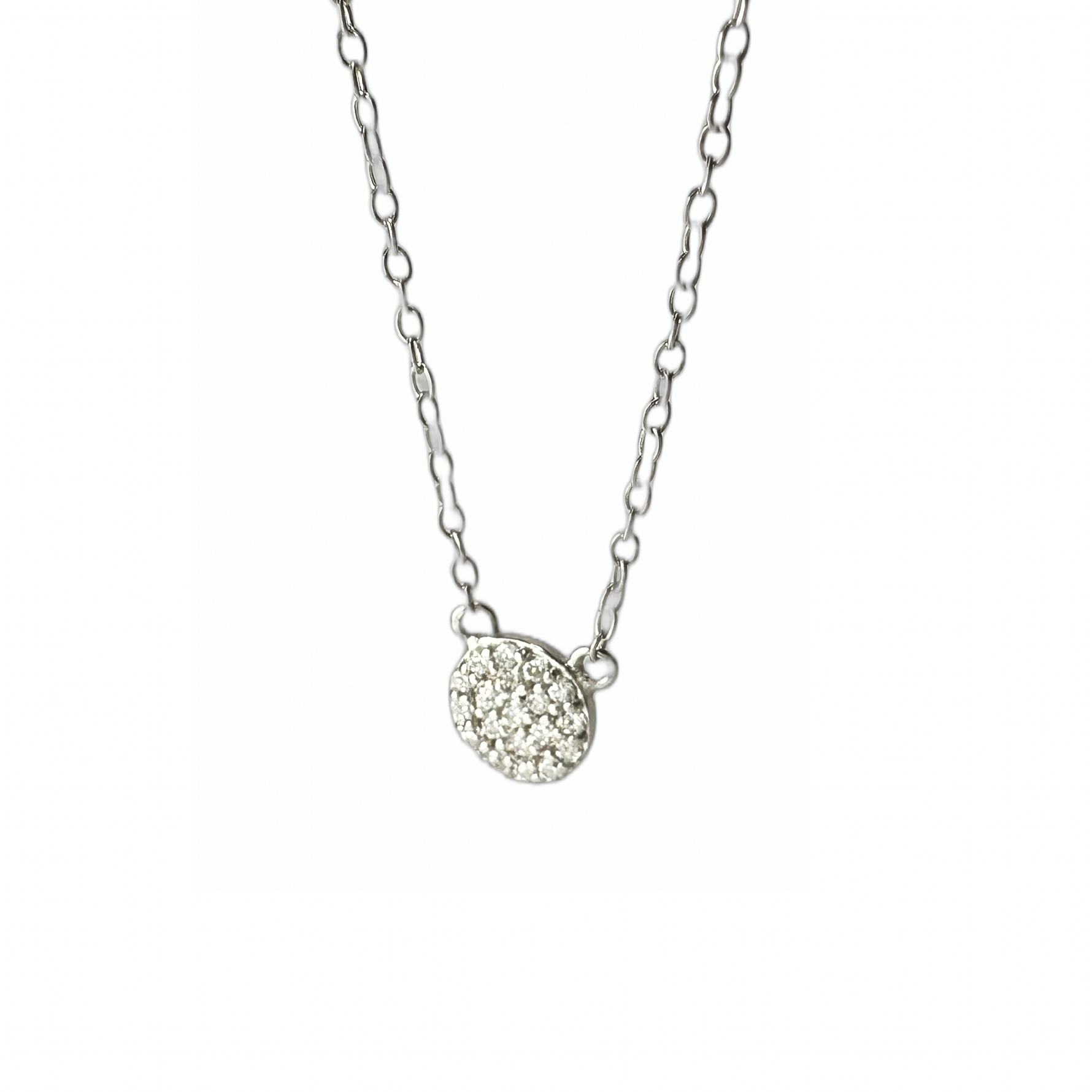 Unit price / perA scrumptious mini coin necklace that looks divine with just about anything! Made of .925 sterling silver. Featuring an elegant mini coin shaped disc at center. Micro pave cubic zirconia stones make the coin dazzle. Chain with spring ring clasp is the ideal length for layering. Pair with a single pearl necklace in sterling silver for a classy day-to-night appeal.
