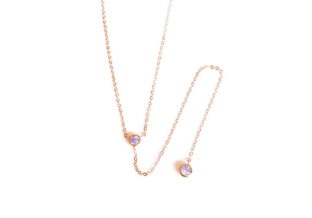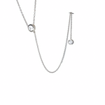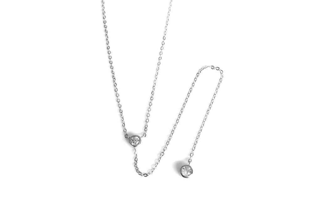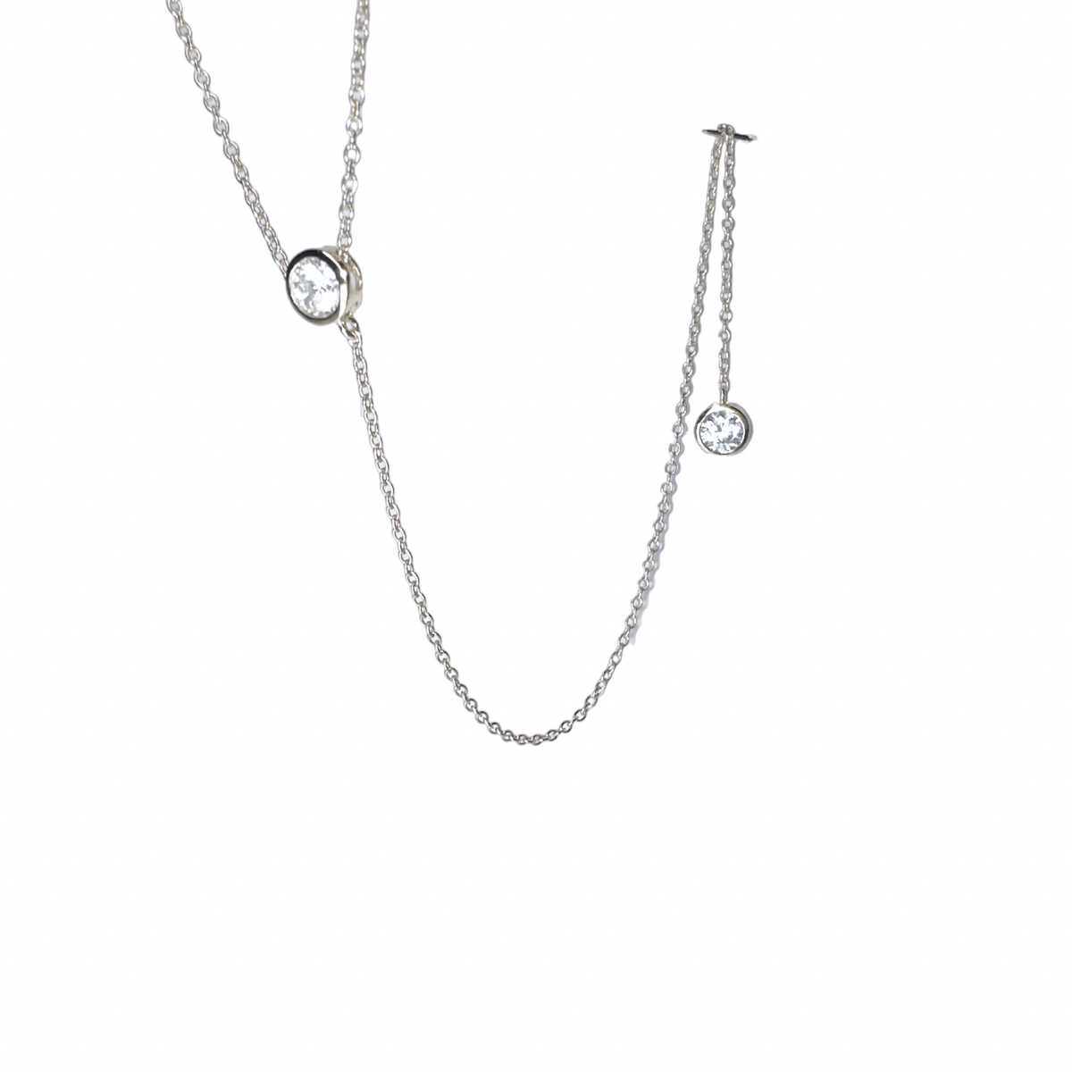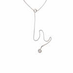 CZ lariat solitaire necklace Made of .925 sterling silver. Rhodium Plated. Featuring two 6mm cubic zirconia at center set in bezelsetting. Simple and versatile. Great for layering Picture is magnified for detail.