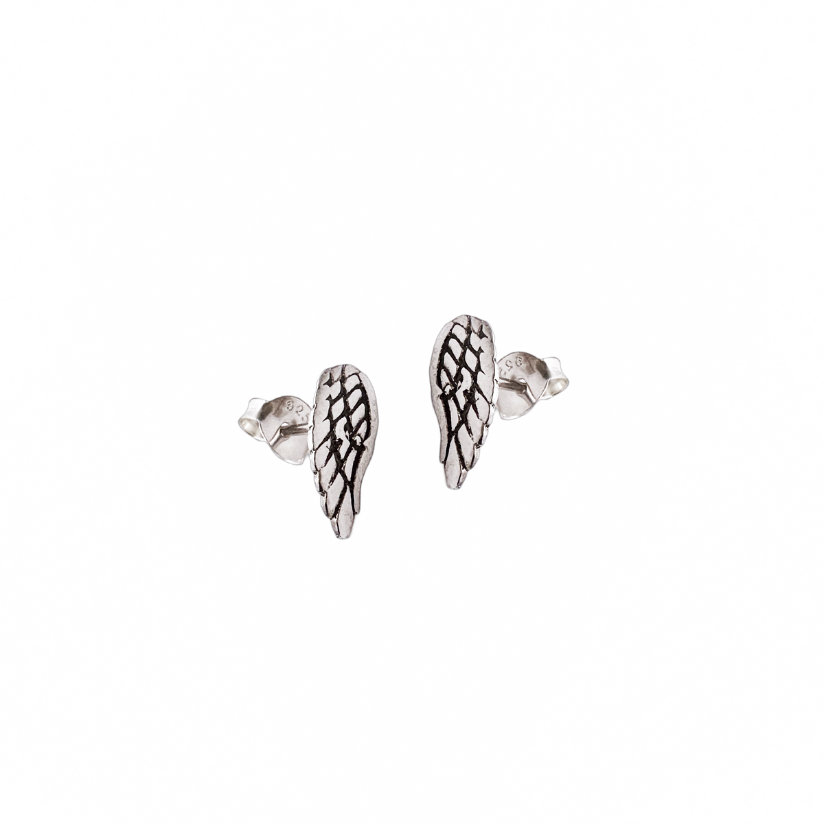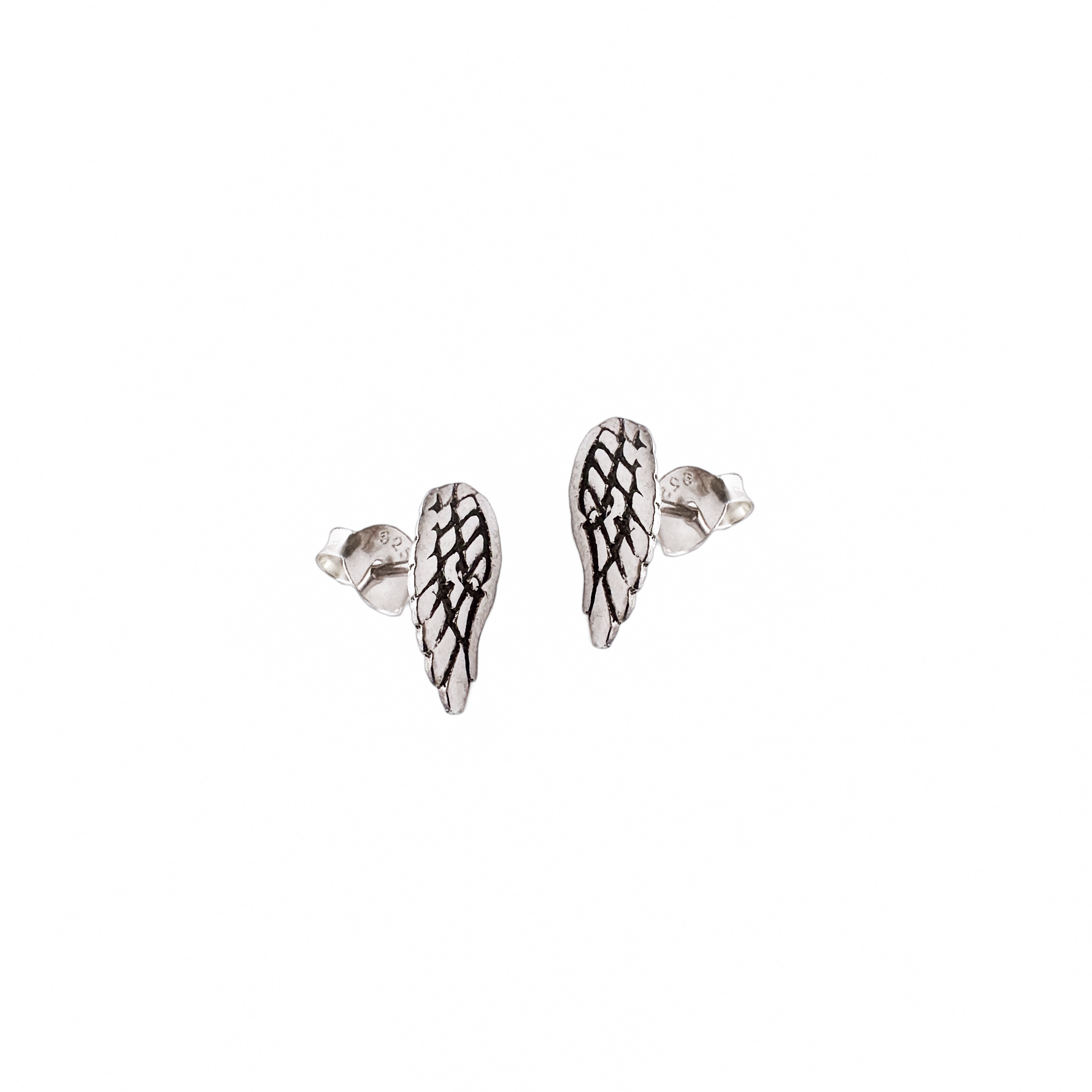 small angel wing earrings, made of .925 sterling silver. intricate detail, lovely stud earring for everyday wear.