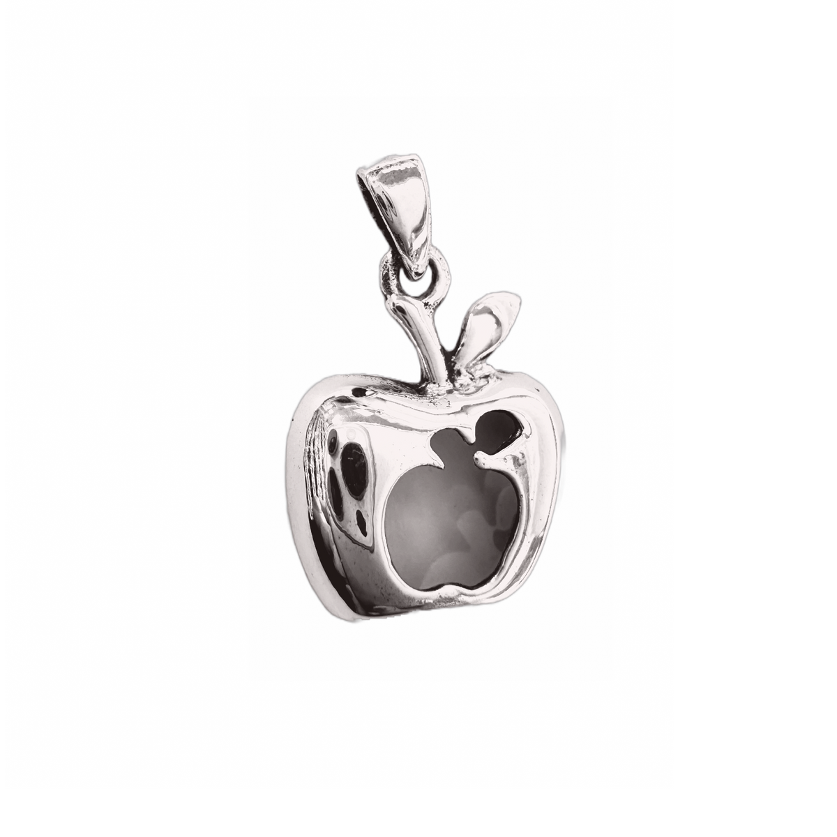 Silver apple pendant, set in .925 sterling silver. Add it to your favorite necklace or layer it with other fruit jewelry. Featuring an apple inside an apple. Strawberry dimples included.apple symbolize wisdom.