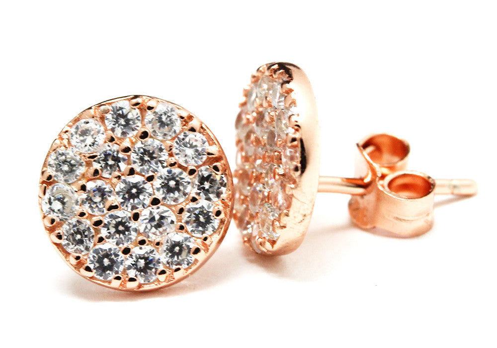 Light up a room with these very versatile and luxurious pave coin stud earrings. Made of .925 sterling silver and dipped in rose gold. An array of micro pave cubic zirconia stones give these earrings an unforgettable sparkle. Post earrings lay flat on earlobe. We recommend pairing with a mini solitaire necklace in rose gold for a sophisticated look.