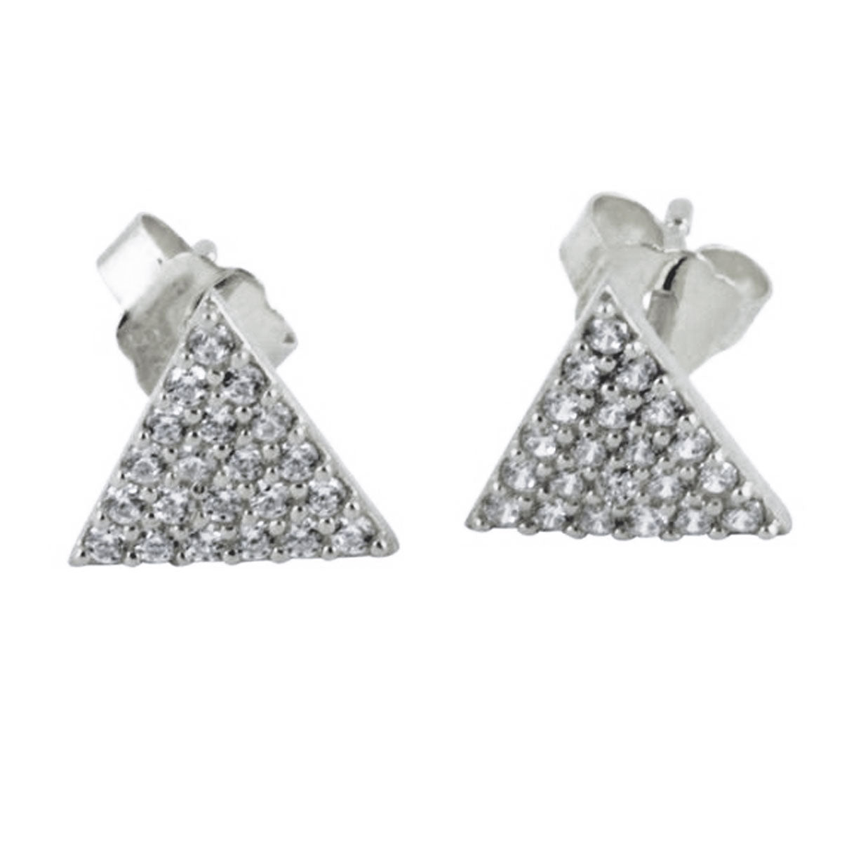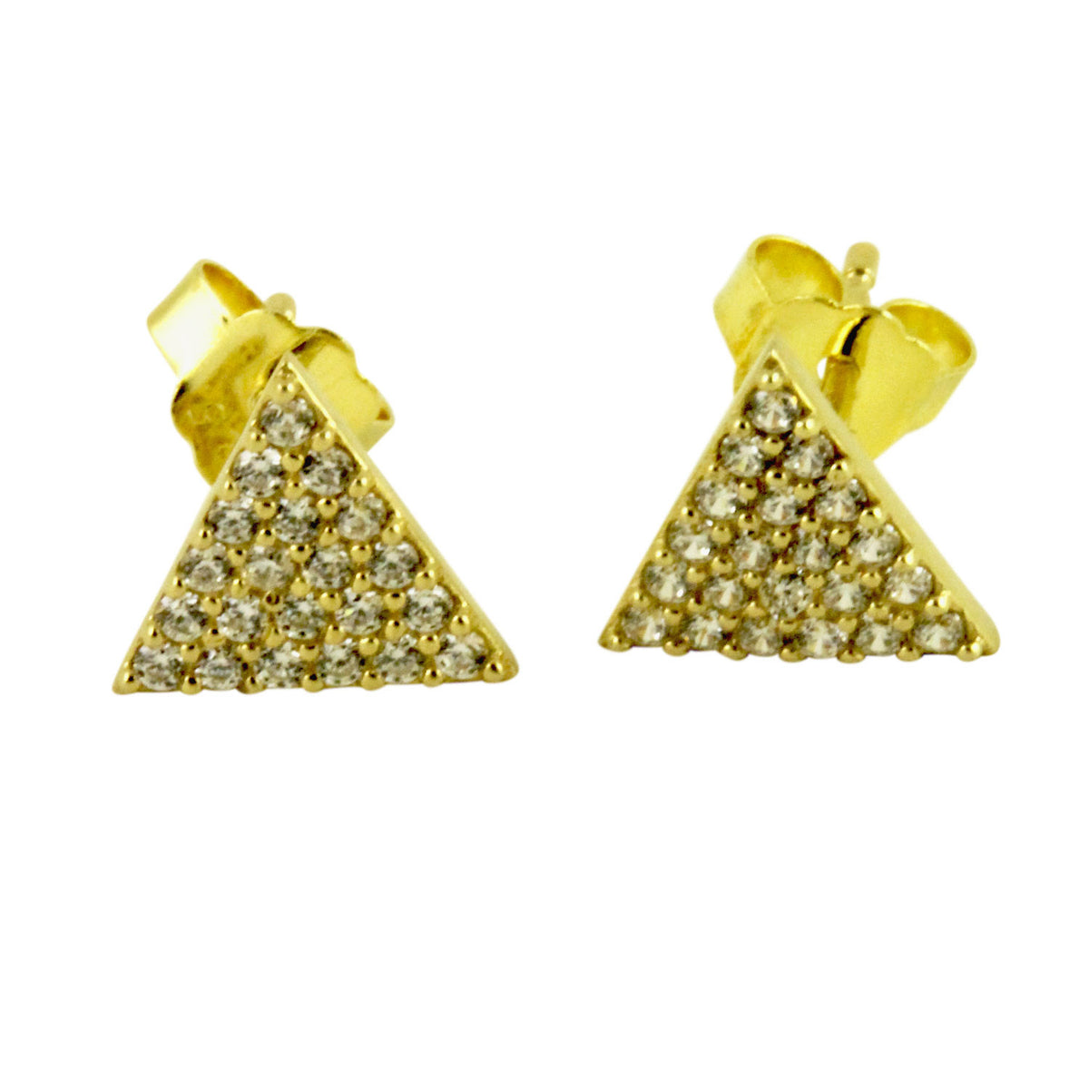 Shine in a room with these very versatile and luxurious pave triangle stud earrings. Made of .925 sterling silver and dipped in gold. An array of pave cubic zirconia stones give these earrings an unforgettable sparkle. Post earrings lay flat on earlobe.