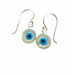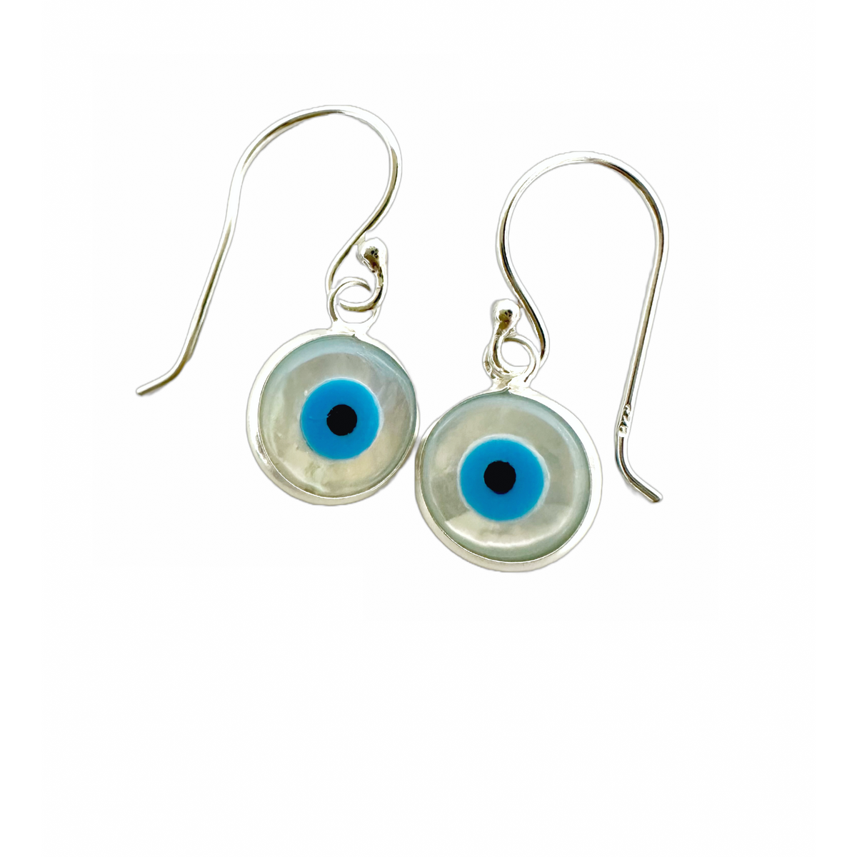 Watch out! Evil eye drop earrings featuring a fashionable white rmother of pearl style center. Bezel Shaped in oval and round shape, choose your favorite. Made of .925 sterling silver setting. Cute Evil eye drop earrings. Irriidiscent mother of pearl. Great for everyday wear.