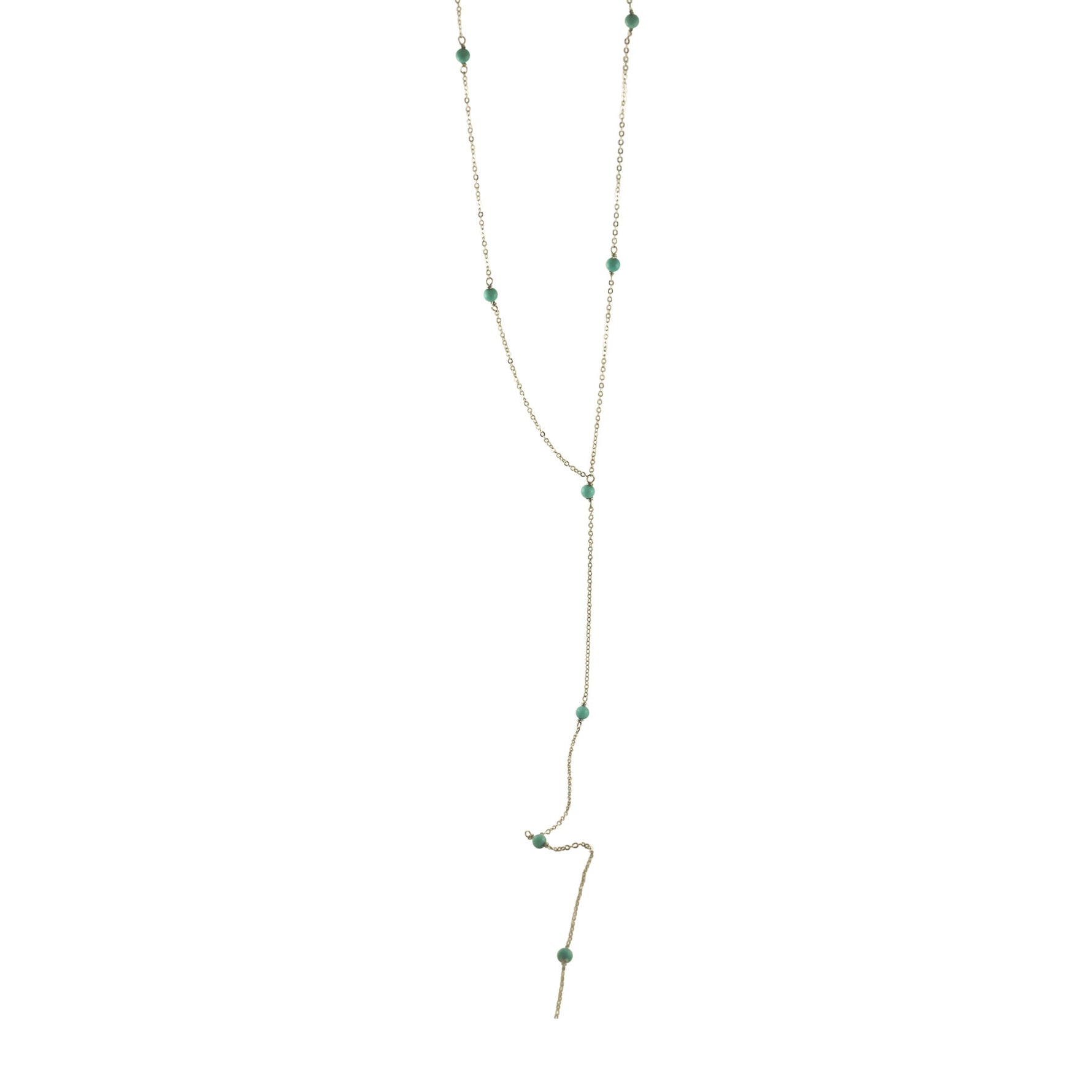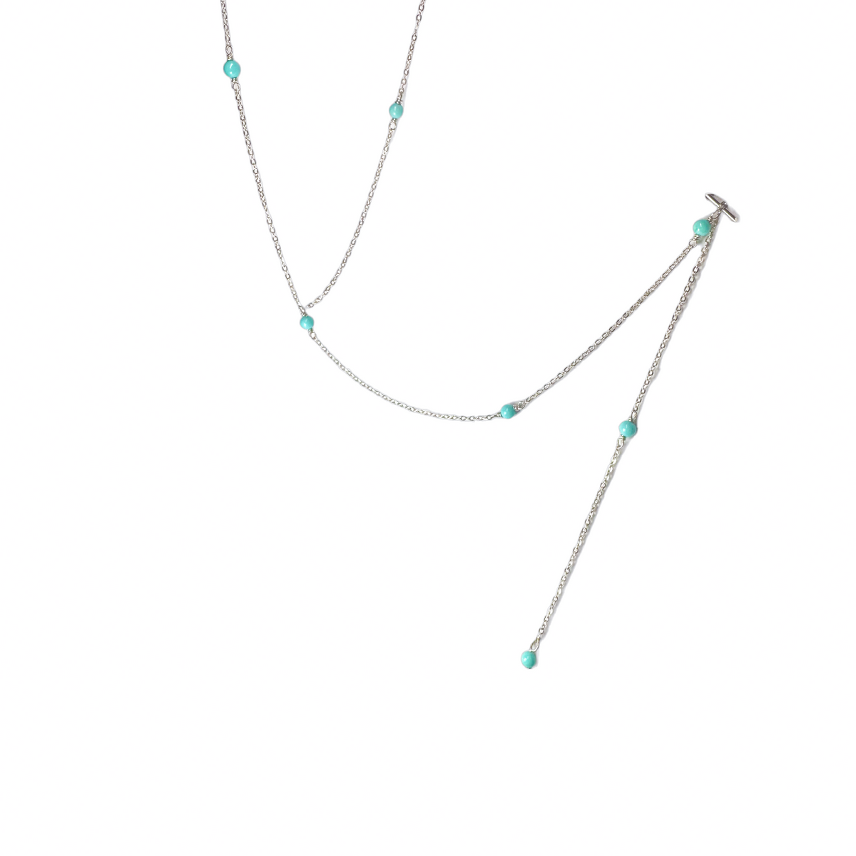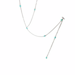 a cascading turquoise lariat necklace that is sure to jazz up any outfit. Made of .925 sterling silver and tiny blue simulate turquoise beads. a gorgeous simple chain features a vertical chain at center with a 12 inch chain drop. Beautiful lariats never go out of style.  Spring Ring clasp. For a complementing look, pair with bar stud earrings. Y Necklace