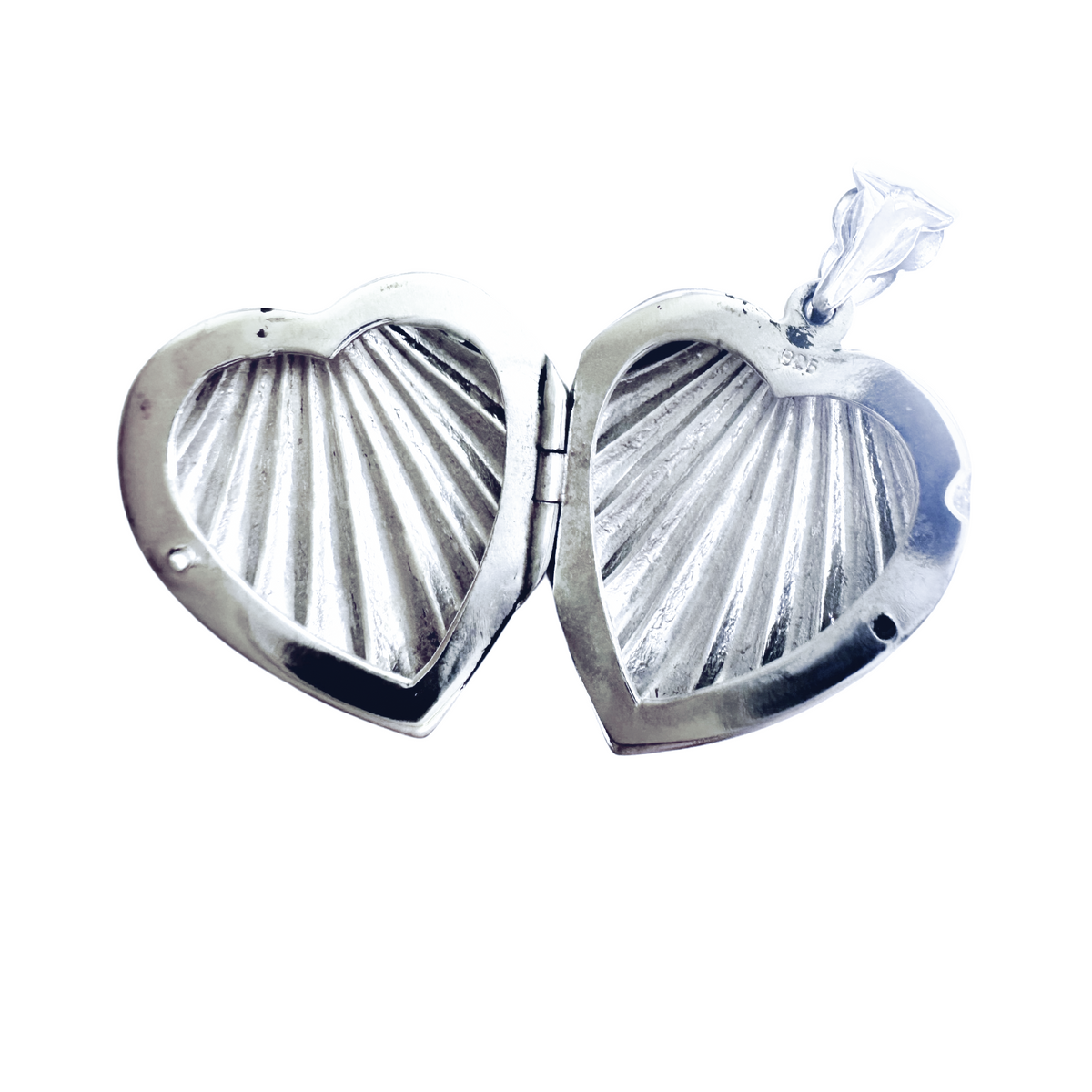heart shaped silver locket, Made of .925 sterling silver. Heart locket with ridged mirror design Silver locket opens may store a small token on each side. Comes with nice chain, beaded or link chain, your choice.