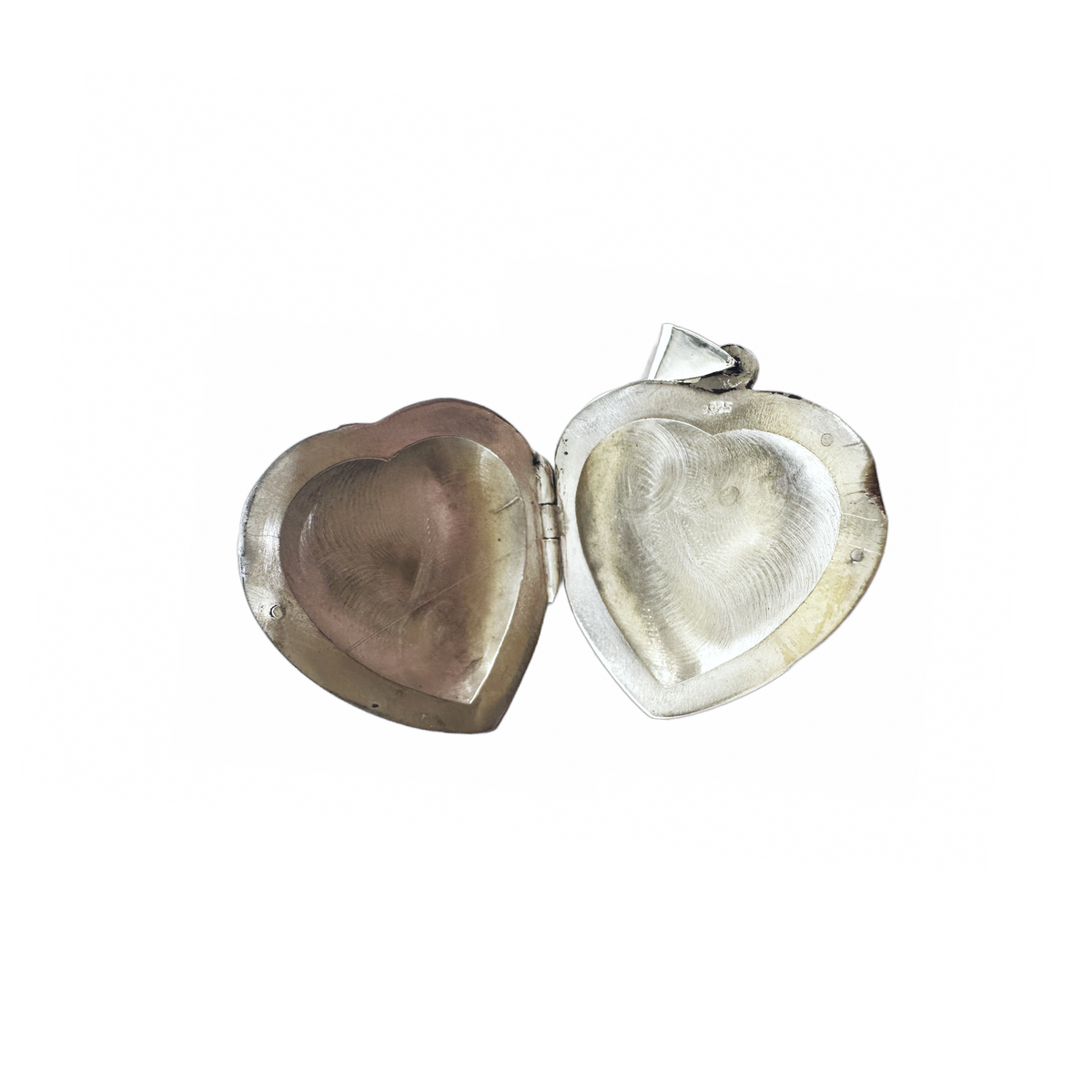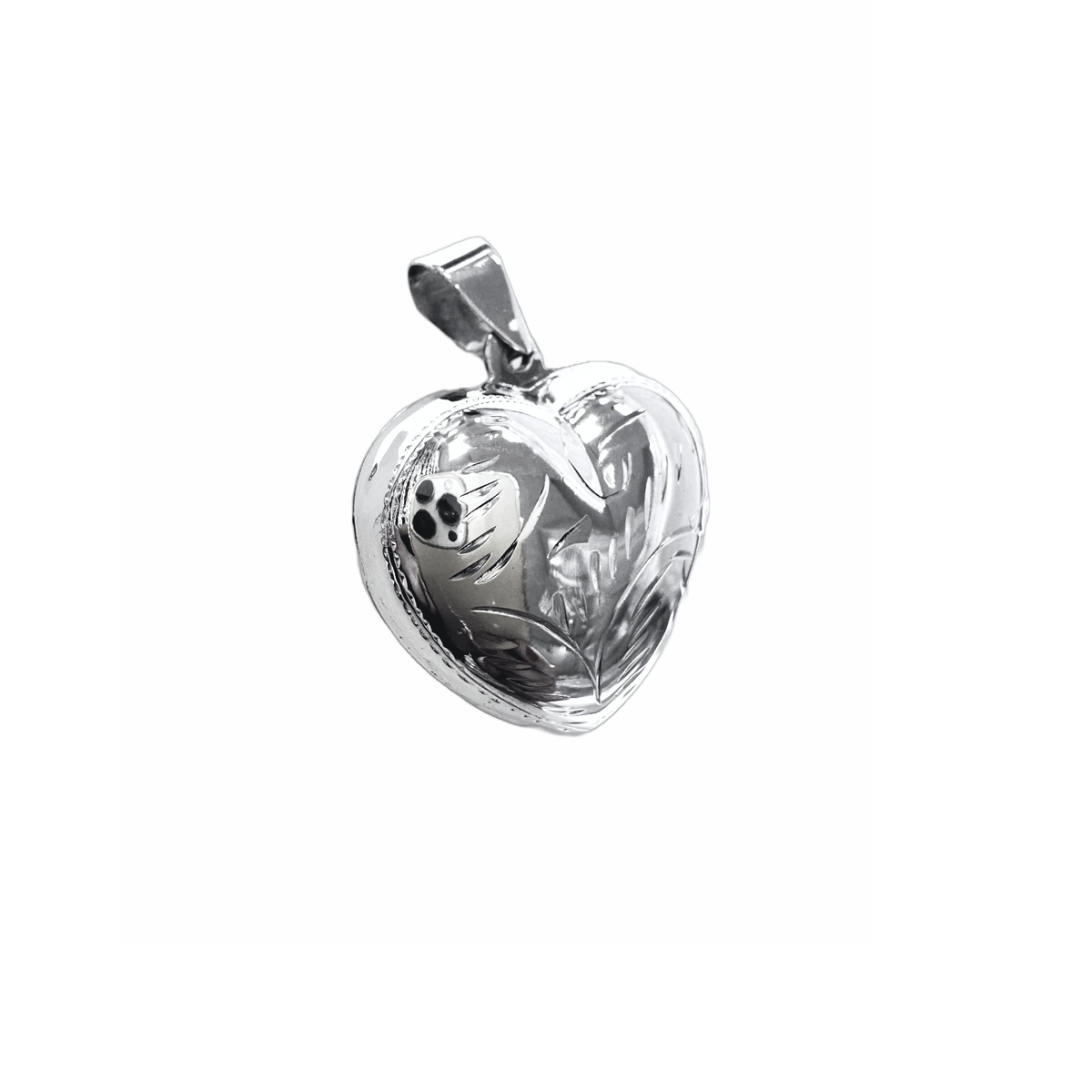 Silvdr heart locket is Made of .925 sterling silver. heart-shaped, locket with etched accent flowers. Silver locket opens and stores two small photos. Comes with your preferred size chain.